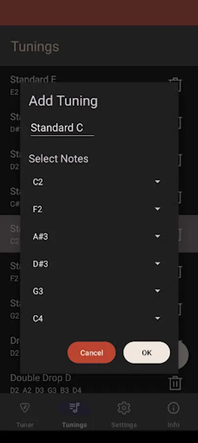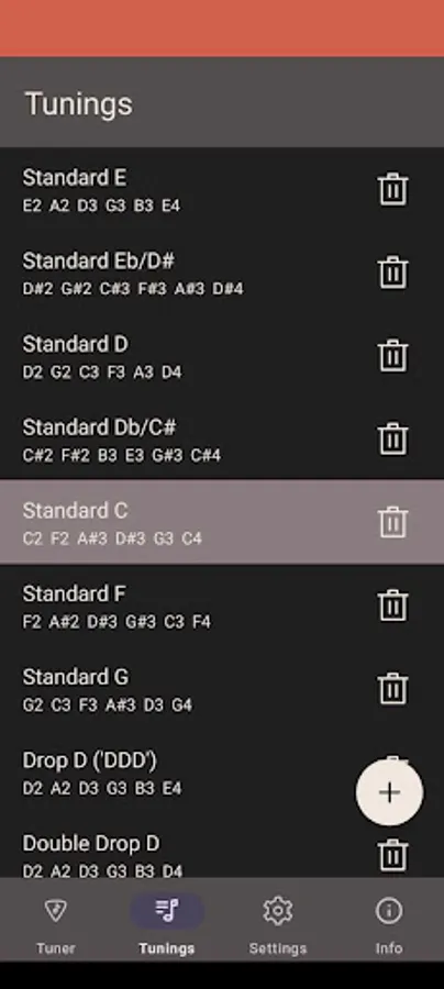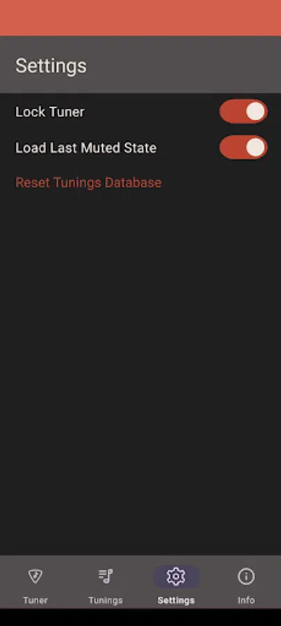 Under the Tunings tab users can find 97 tunings that can be selected to tune their guitar under them. The best thing about Tunings is that all of them can be edited by long touching them and users are able to add custom tunings with no limit. By letting users customize as they want the Tunings tab this might lead to delete one or more tunings by mistake. Therefore, users has the option under Settings tab to "Reset Tunings Database". This function reverts the database to the initial 97 values.