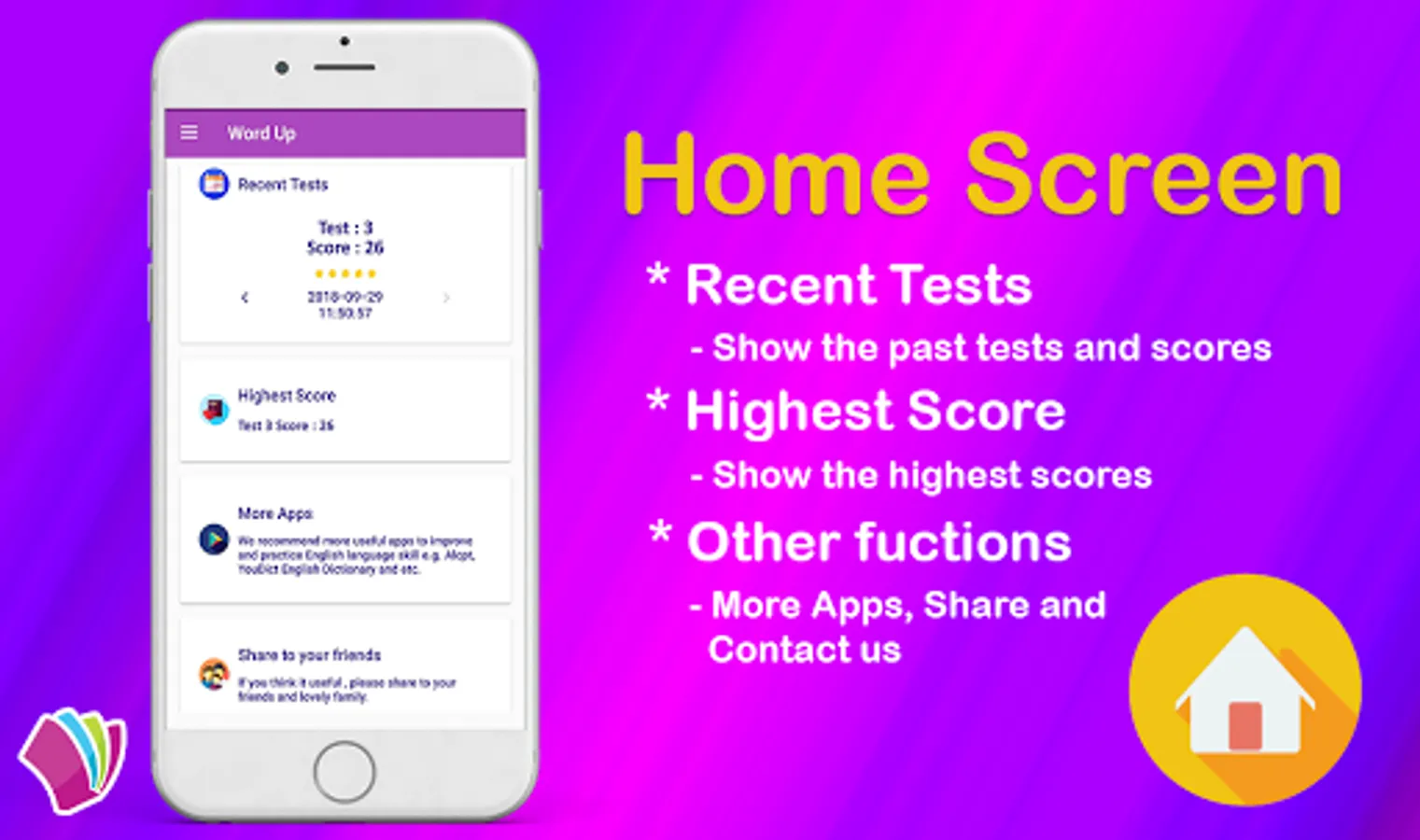 Word Up is the best application to improve your English Language efficiency for TOEIC. By learning the vocabulary which bases on the real situations in the world such as History, Math, Science, Society, and Culture. Word Up contains 1000+ words in more than 100 tests. Each test will have the different difficulty that suitable for all levels of users.