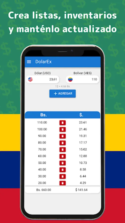Your ideal tool for shopping at the supermarket, setting up a budget or quote, managing your inventory or simply finding out the value of the dollar with respect to the bolivar.