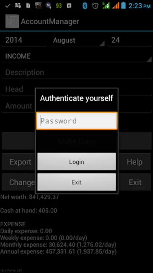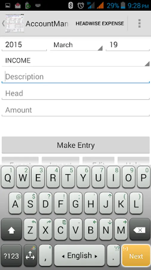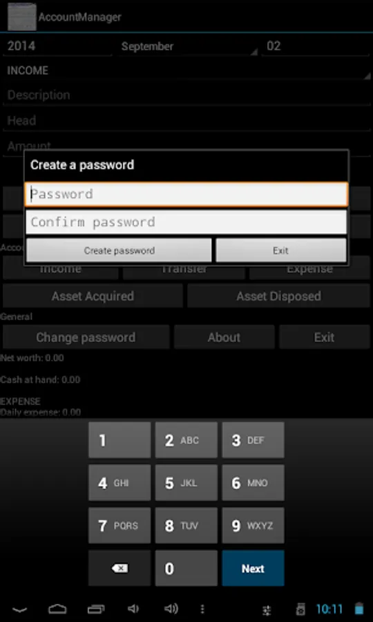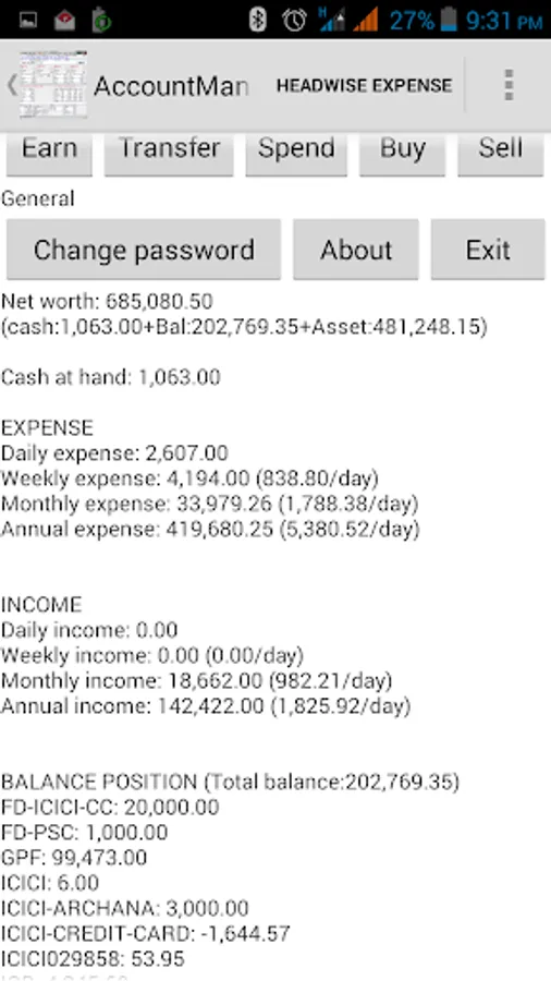 Pressing Export button creates text file containing all the transactions and permits sharing of the same over any available means. This file can be sent to another device or computer, copied to the clipboard and then imported into account manager.