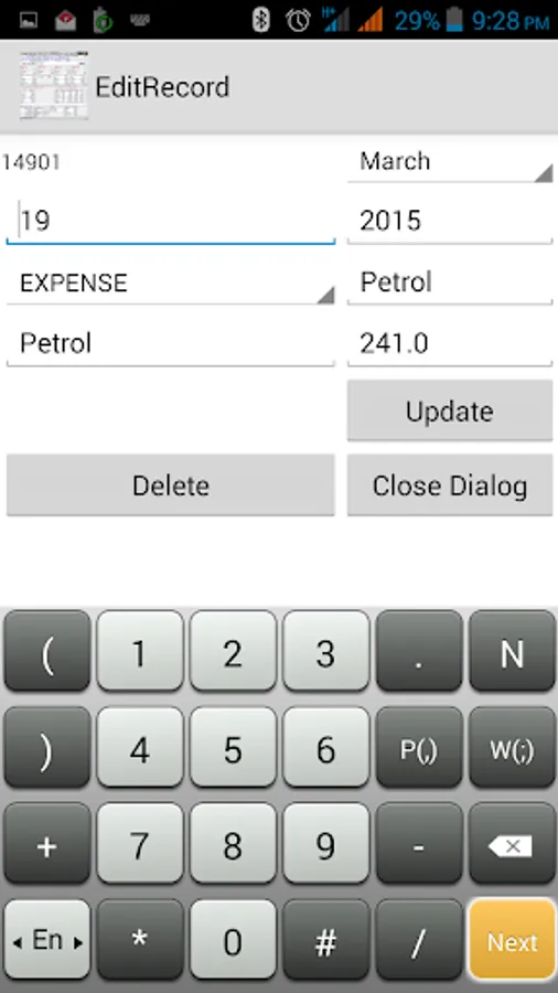 Any mistakes made in transaction entry may be corrected by pressing Review Transaction button. It fetches a list of items. Click the wrong transaction. A separate dialog opens to permit editing of the values. Pressing I date button saves the changes. Pressing Delete button deletes that particular record from the database.