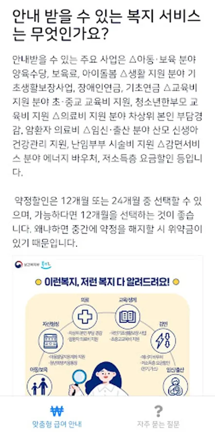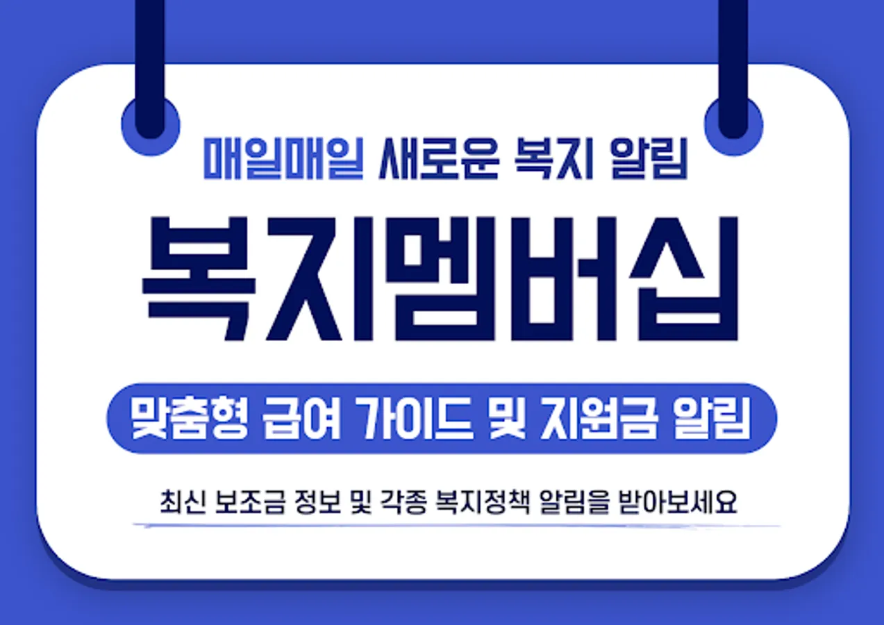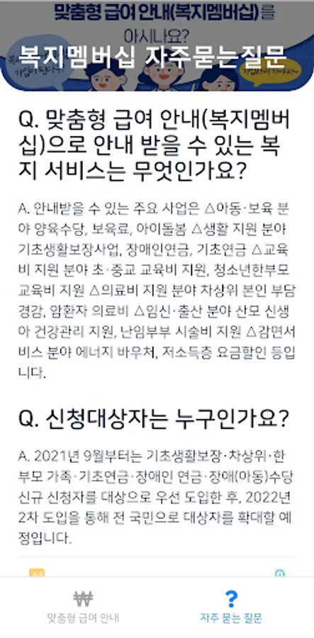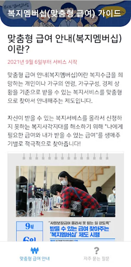 This application is an application that summarizes the introduction and application method for "welfare membership (customized salary guide)" to be implemented from September 2021. Through this system, you can find and receive customized welfare services based on the age, household composition, and economic situation of individuals or households wishing to receive welfare benefits.