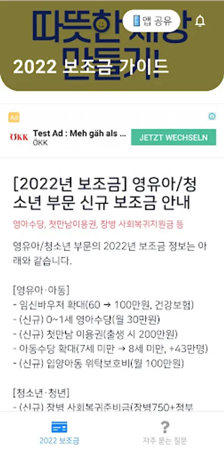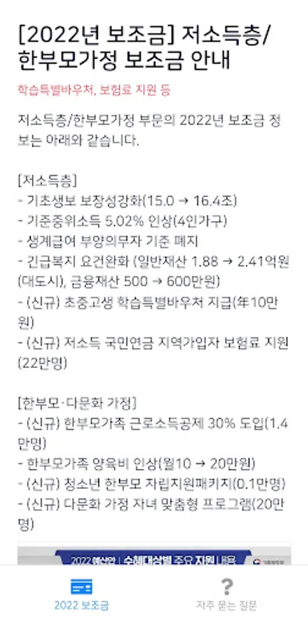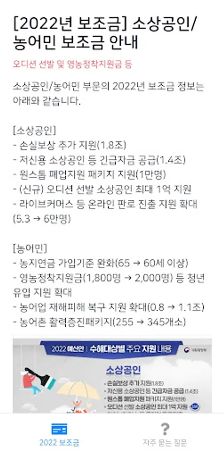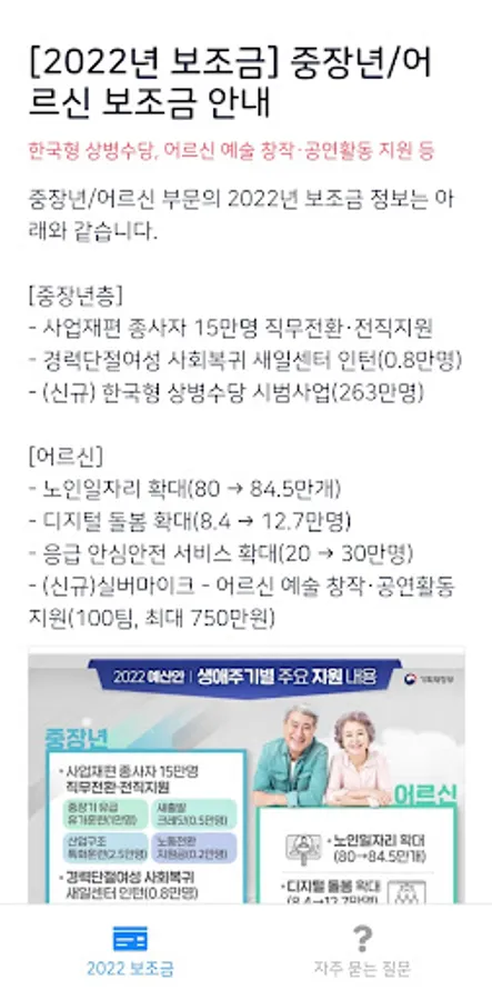 2023년부터 지급되는 보조금에 대한 정보를 제공하는 어플리케이션입니다. 부모급여, 긴급생계비, 청년도약계좌, 노년층 고용장려금 등 추가되는 여러가지 보조금 정보를 확인해보세요.