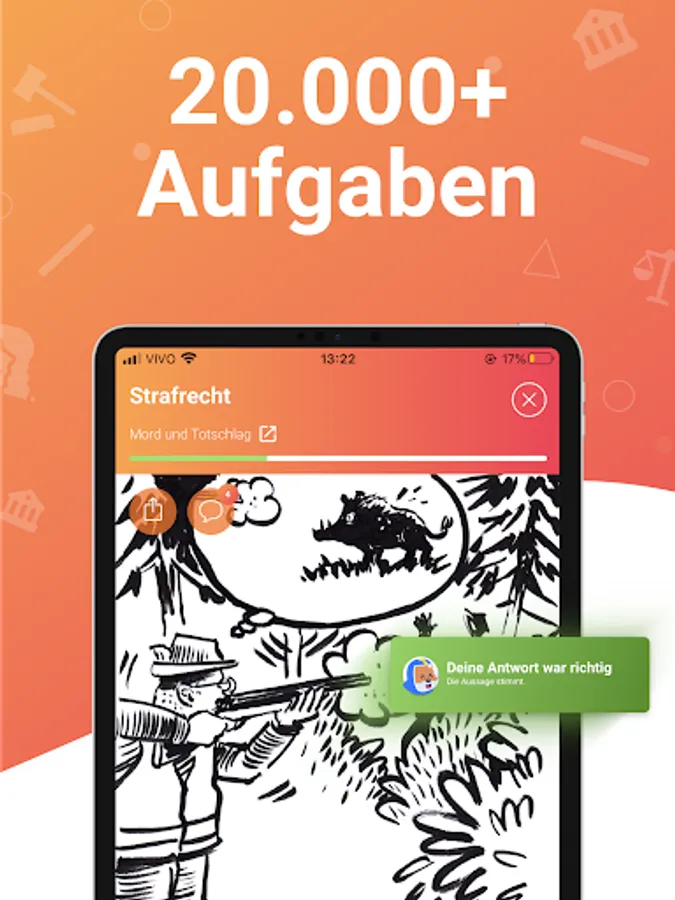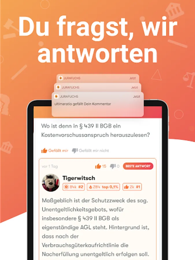 In short lessons and with the help of real cases, Jurafuchs teaches you how to apply your legal knowledge right from the start. Jurafuchs contains over 40,000 interactive tasks from all areas of law, which didactically implement the findings of current learning research.