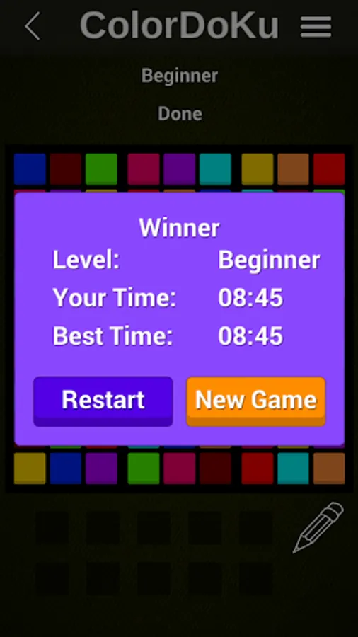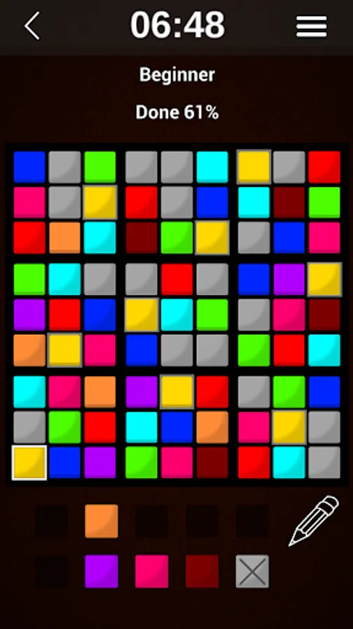 Colordoku is a logic-based, combinatorial color-placement puzzle. The objective is to fill a 9×9 grid with colors so that each column, each row, and each of the nine 3×3 sub-grids that compose the grid (also called "boxes", "blocks", "regions", or "sub-squares") contains different colors. The puzzle setter provides a partially completed grid, which for a well-posed puzzle has a unique solution.