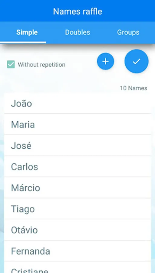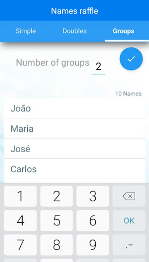 In names mode, you can make a simple raffle, doubles raffle or groups raffle.
