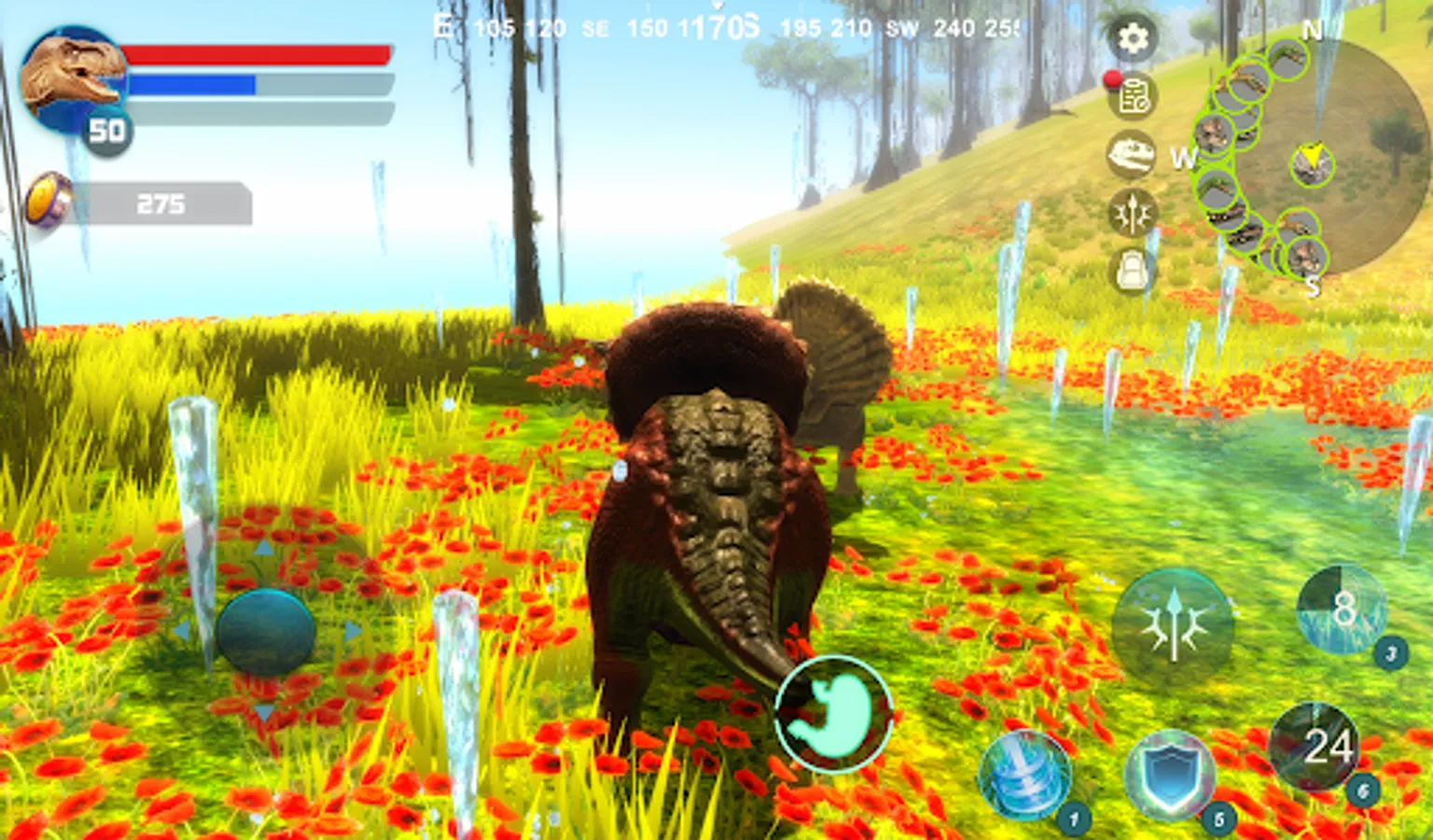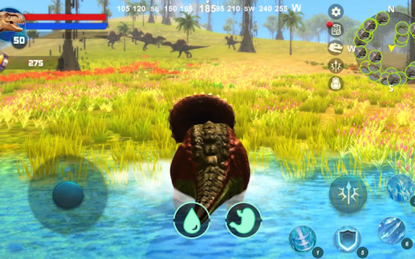 Maintain your health and energy by eating dinos and drinking water, explore massive world, fight other dinosaurs to become more powerful