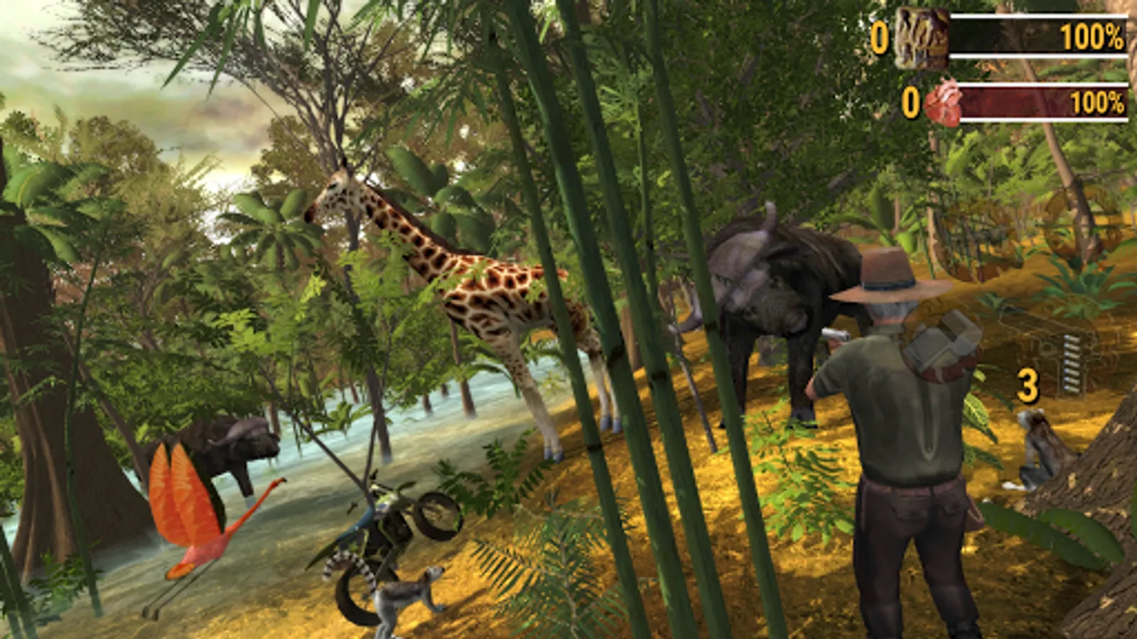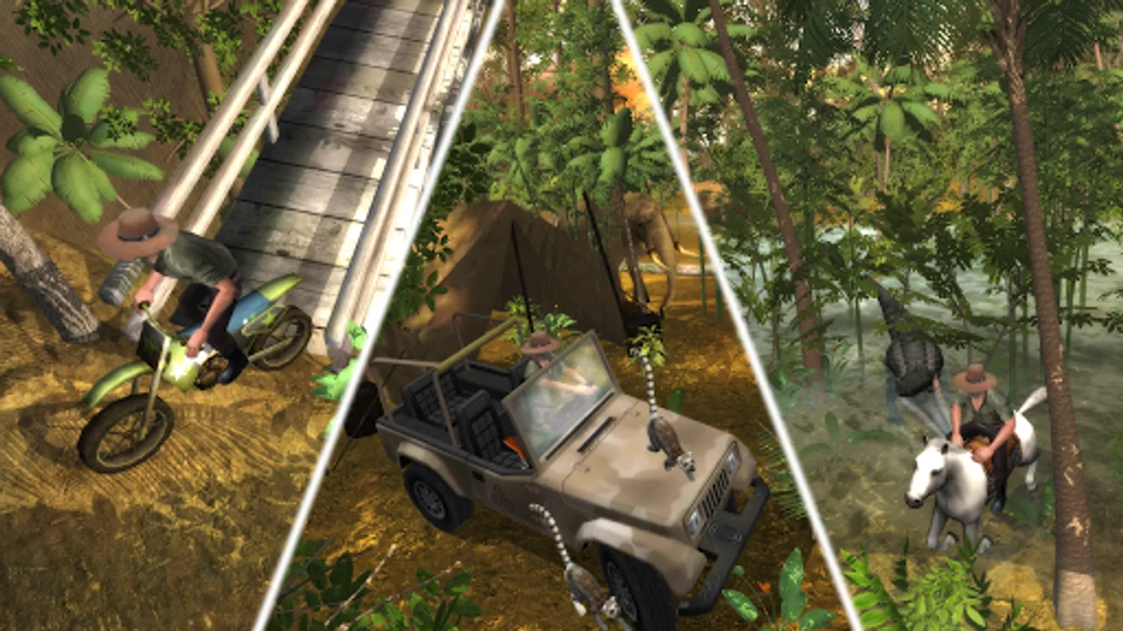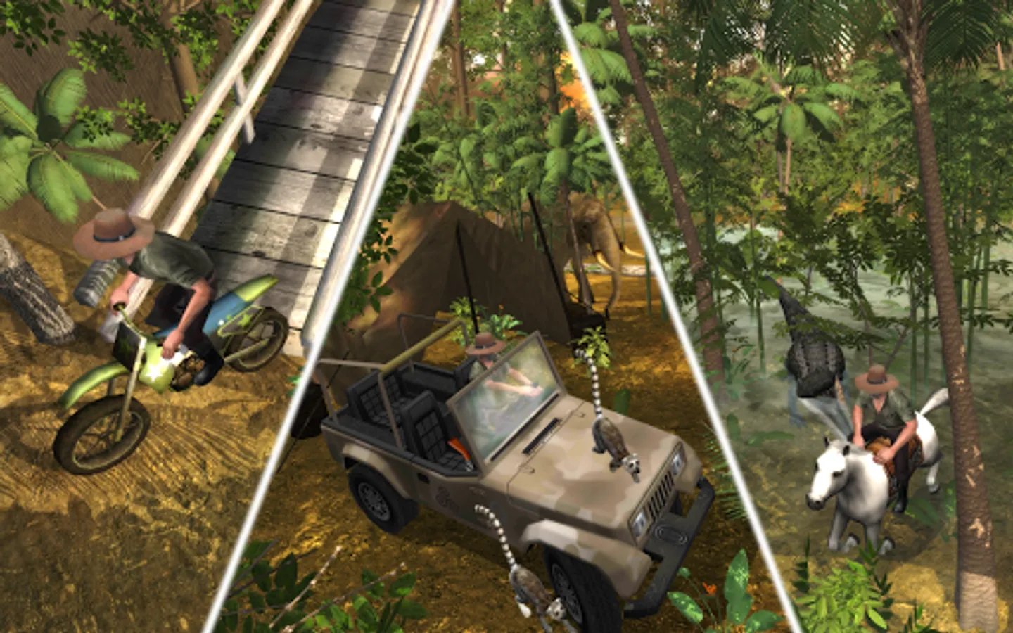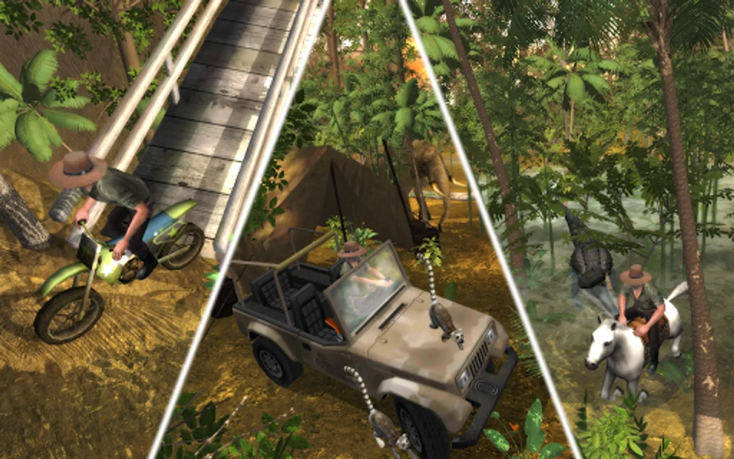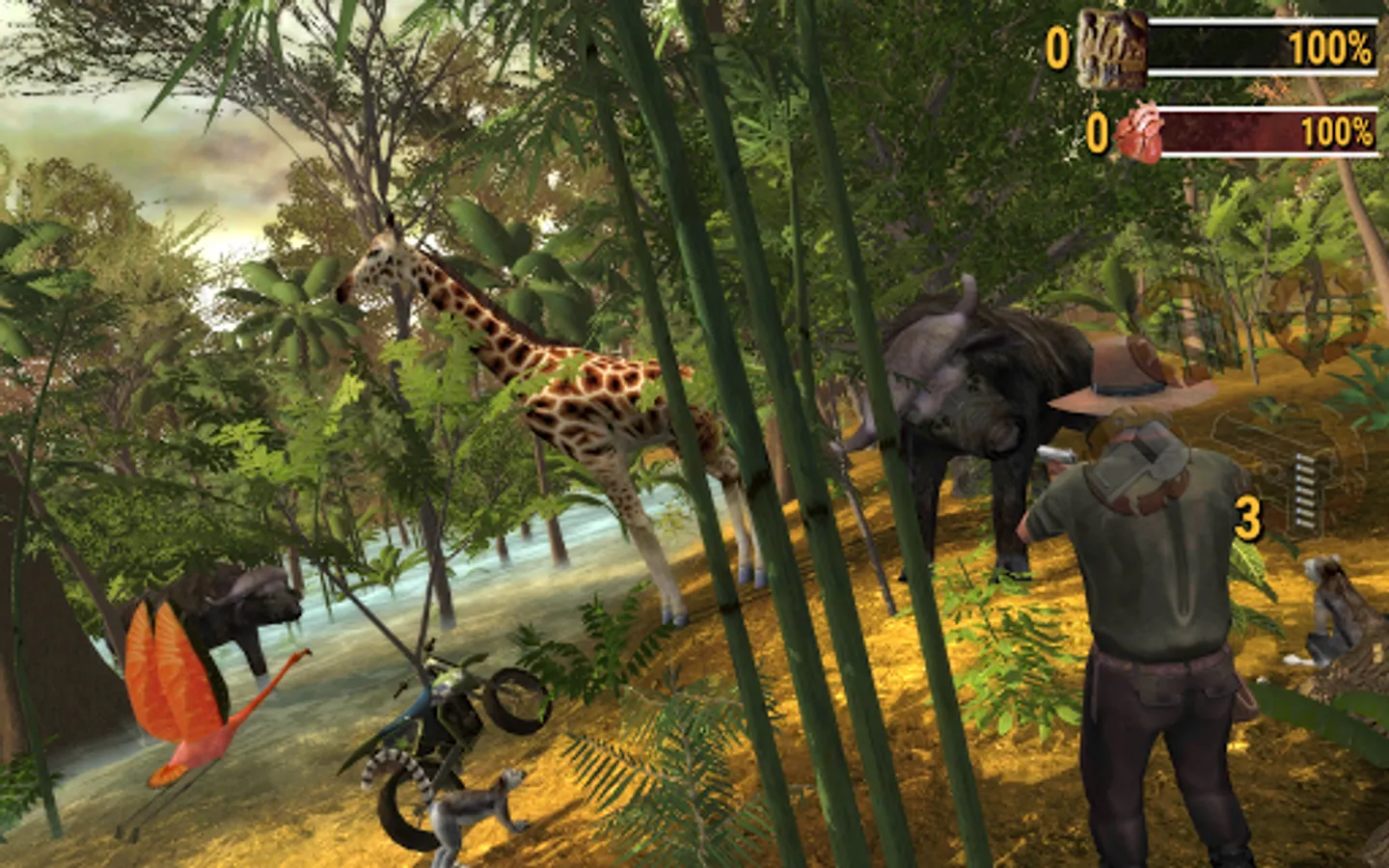 Safari: Evolution has High quality graphics and gameplay, hunt by foot, 4x4 Off-Road Vehicle, Motorbike, Boat or Horse - your faithful friend - Whistle to Call.