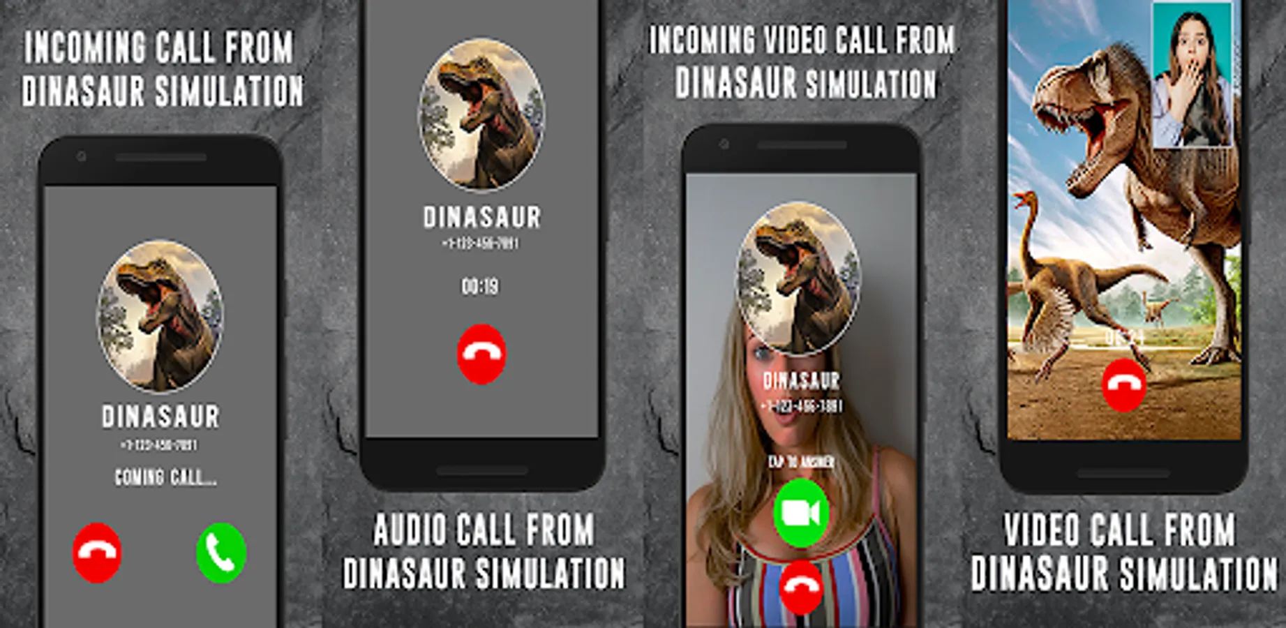Our app allows you make a fake call to dinosaur king , dinos , jura ,Dino's , Dinos , Dinosaru , Dinosaurio , Dinosaurios , Dinosours , Dinossauro , Jurasic Park , Jurassic Dinos all in ONE.