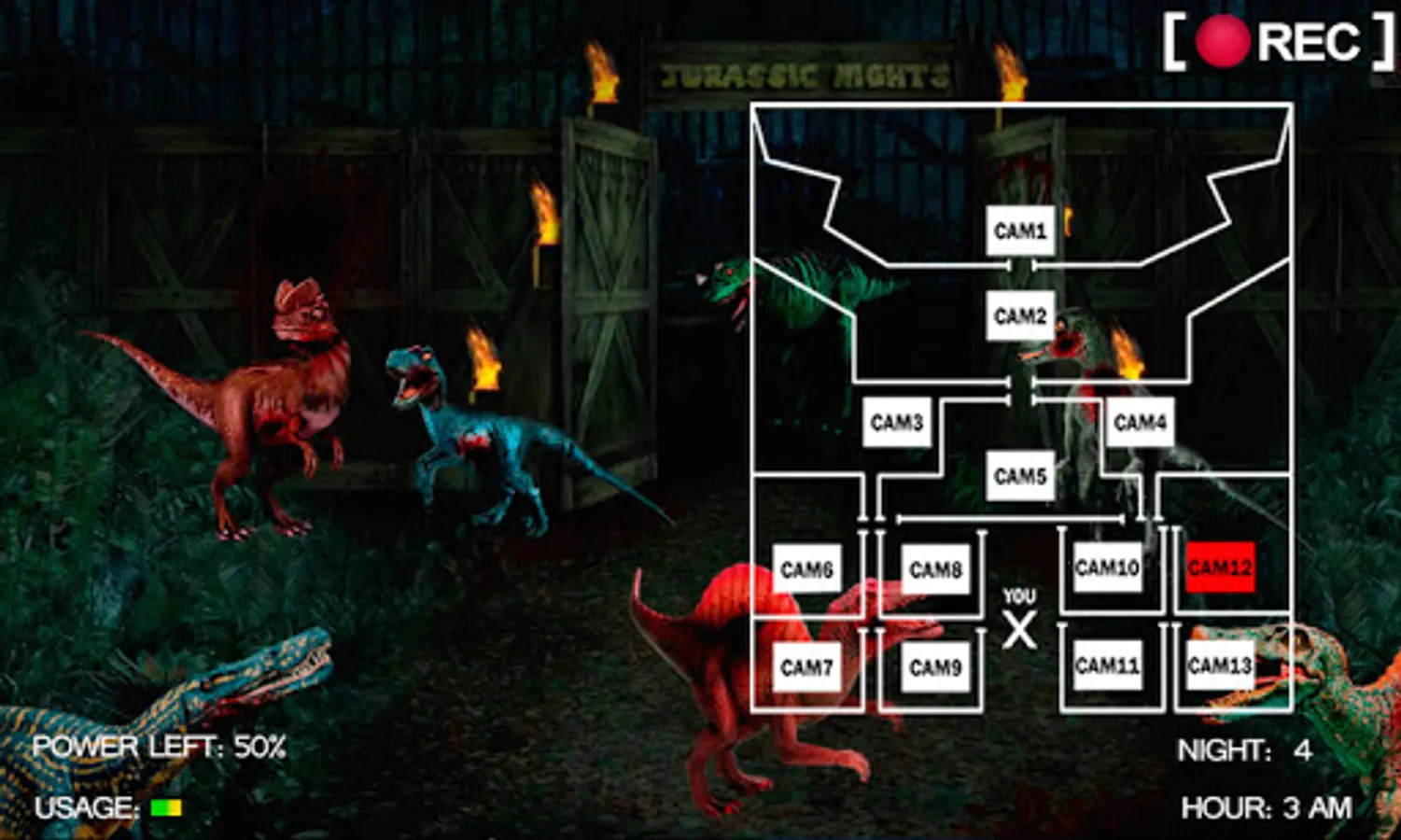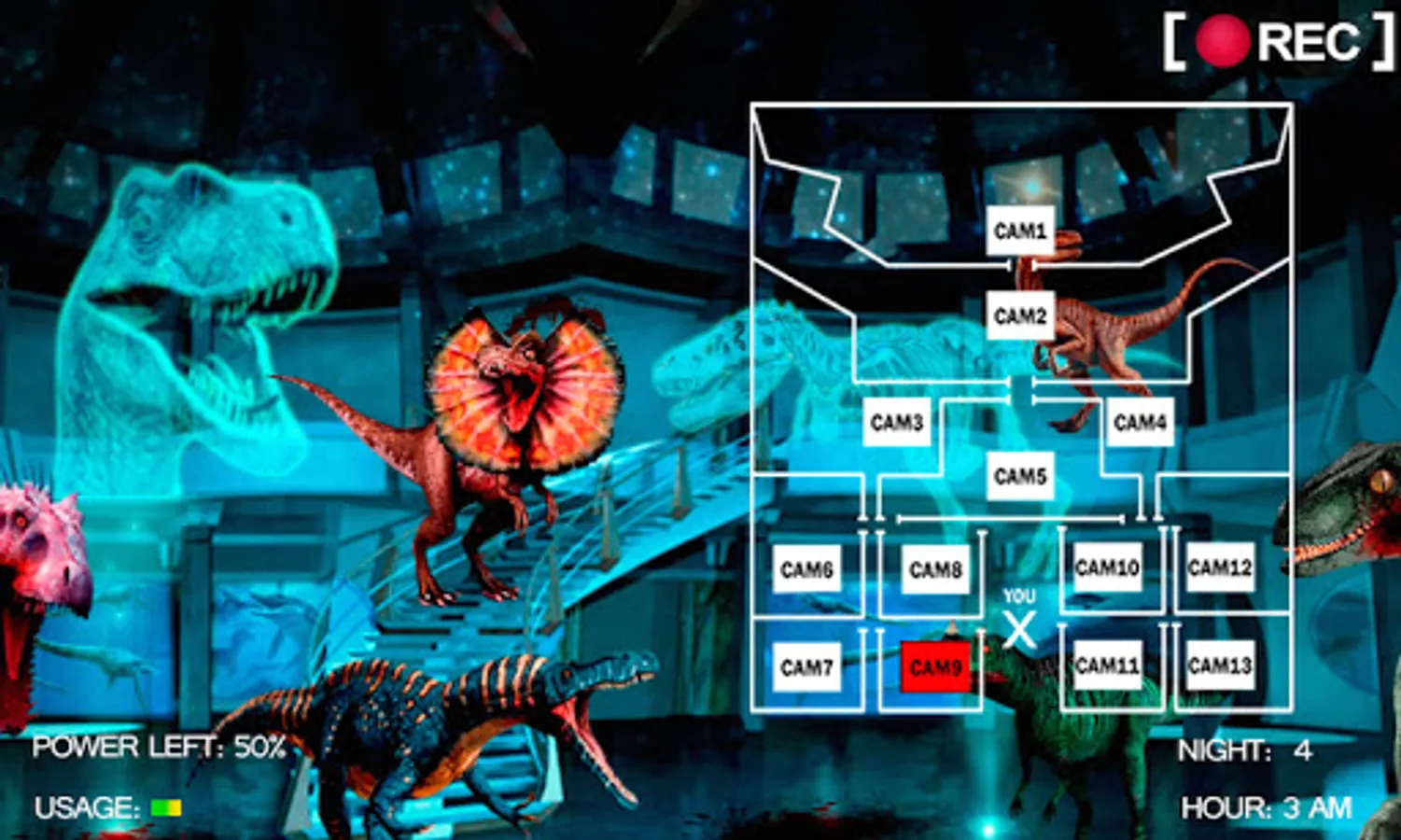 At the Genetic Dinosaur Biotechnology Research Center, there was a technical failure in the security system. You must take shelter at the control room for five nights until help arrives. Check the cameras and close the doors to protect yourself from the fierce Dilophosaurus, the quick Velociraptor and the mighty Tyrannosaurys Rex!