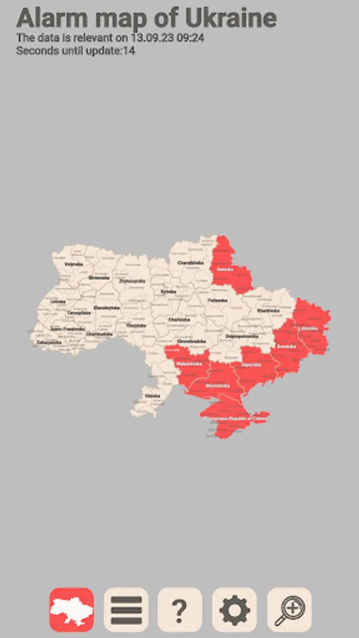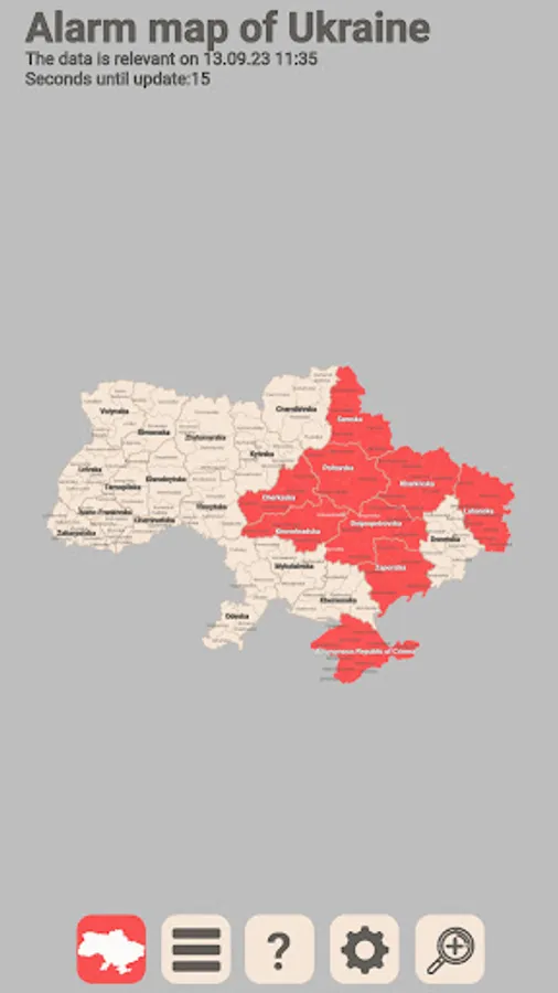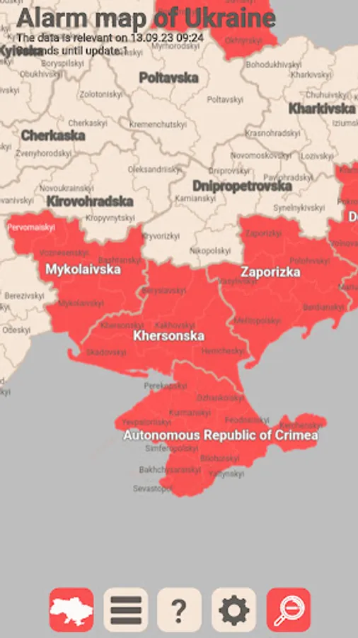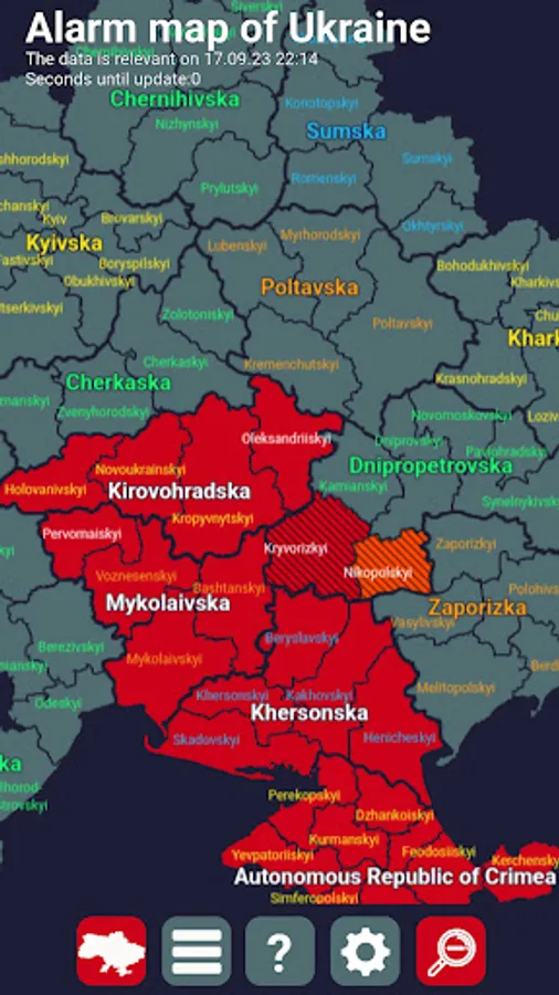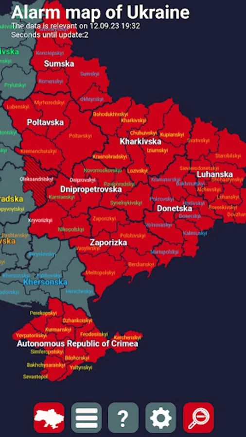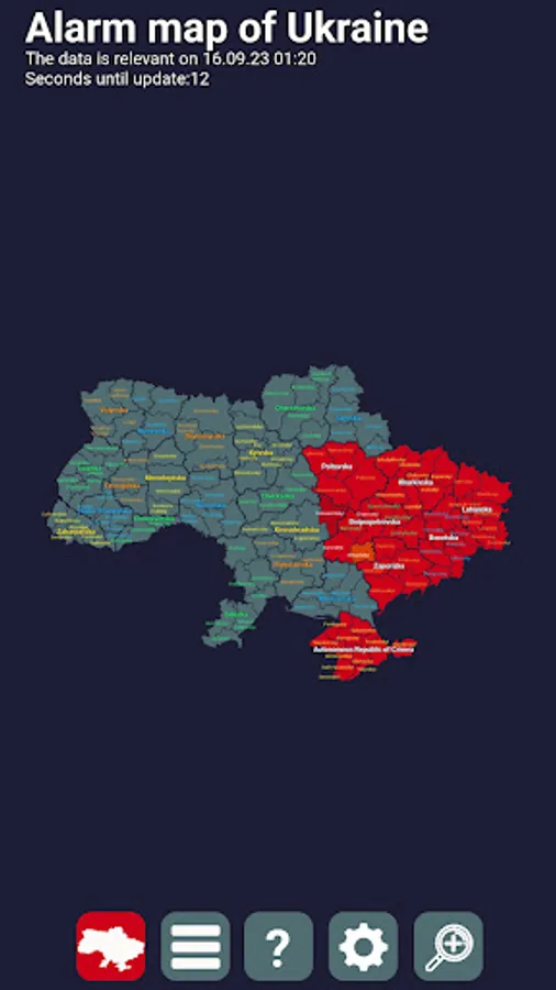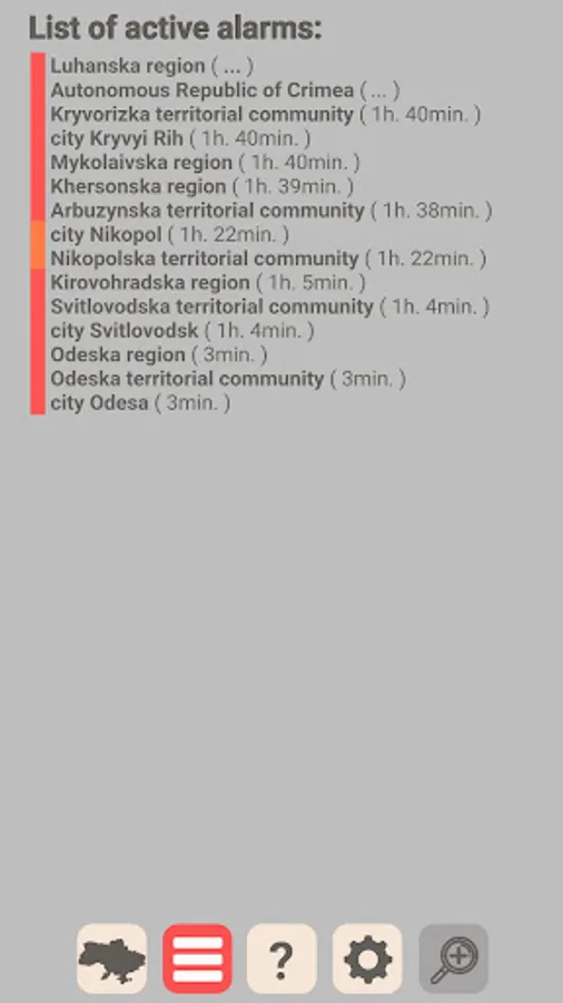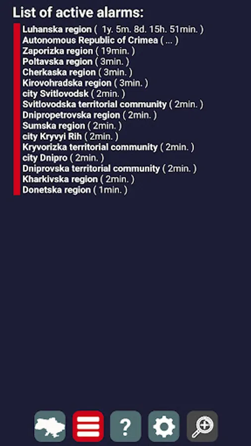 Areas and districts that are currently on alert are colored in a specific color (red, orange, yellow, lime, purple) depending on the type of alert (air alert, artillery threat, street fighting threat, chemical threat, and radiation threat). you can switch the mode to a list and see in which regions the alarm is currently declared, its type and duration as a list.