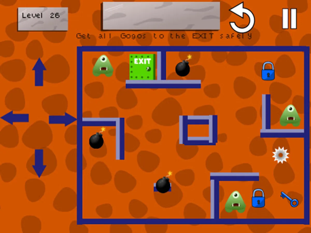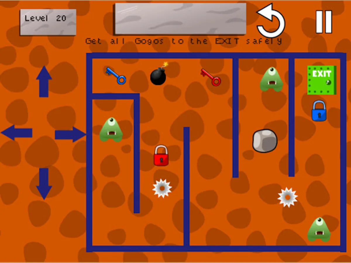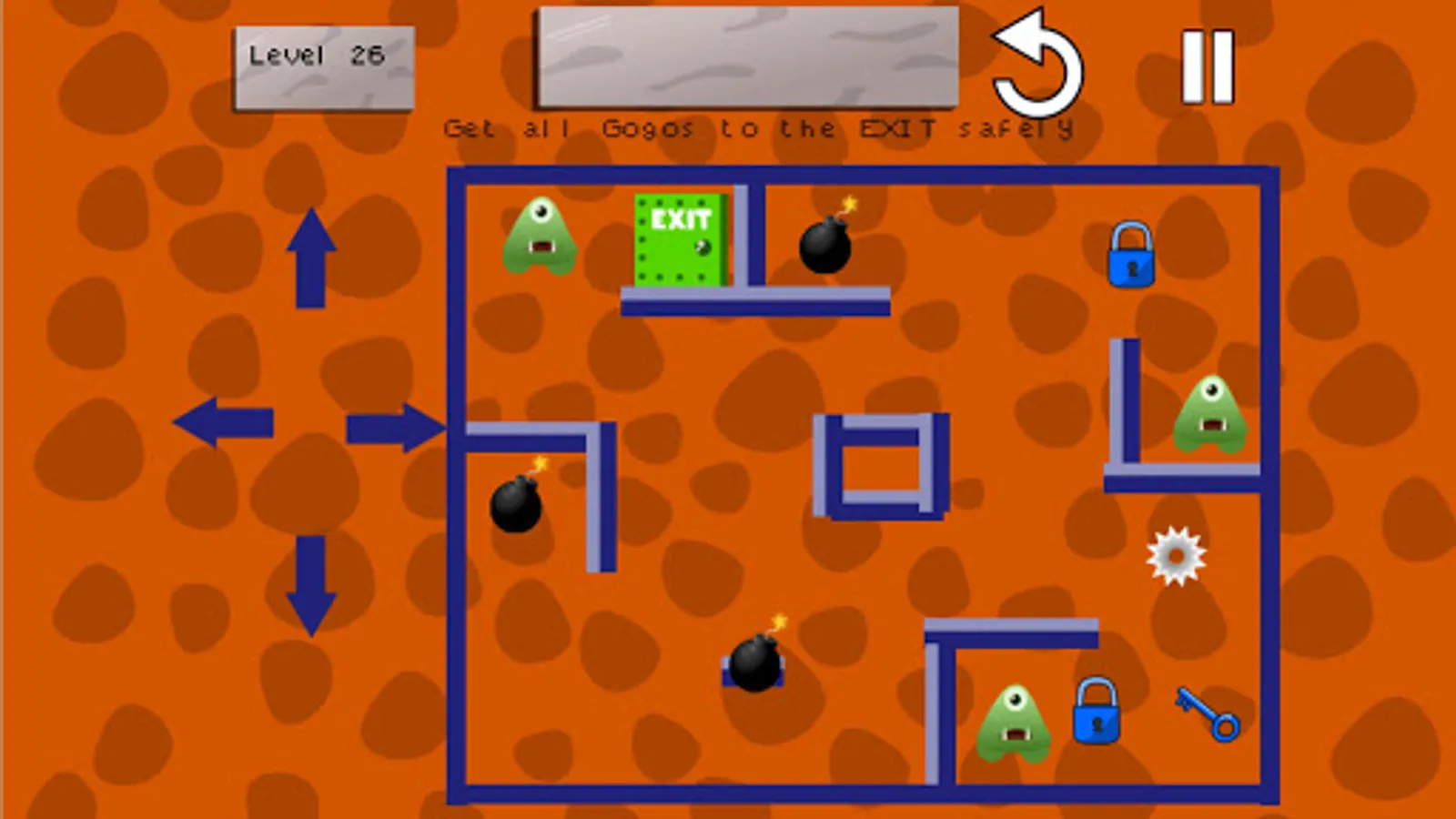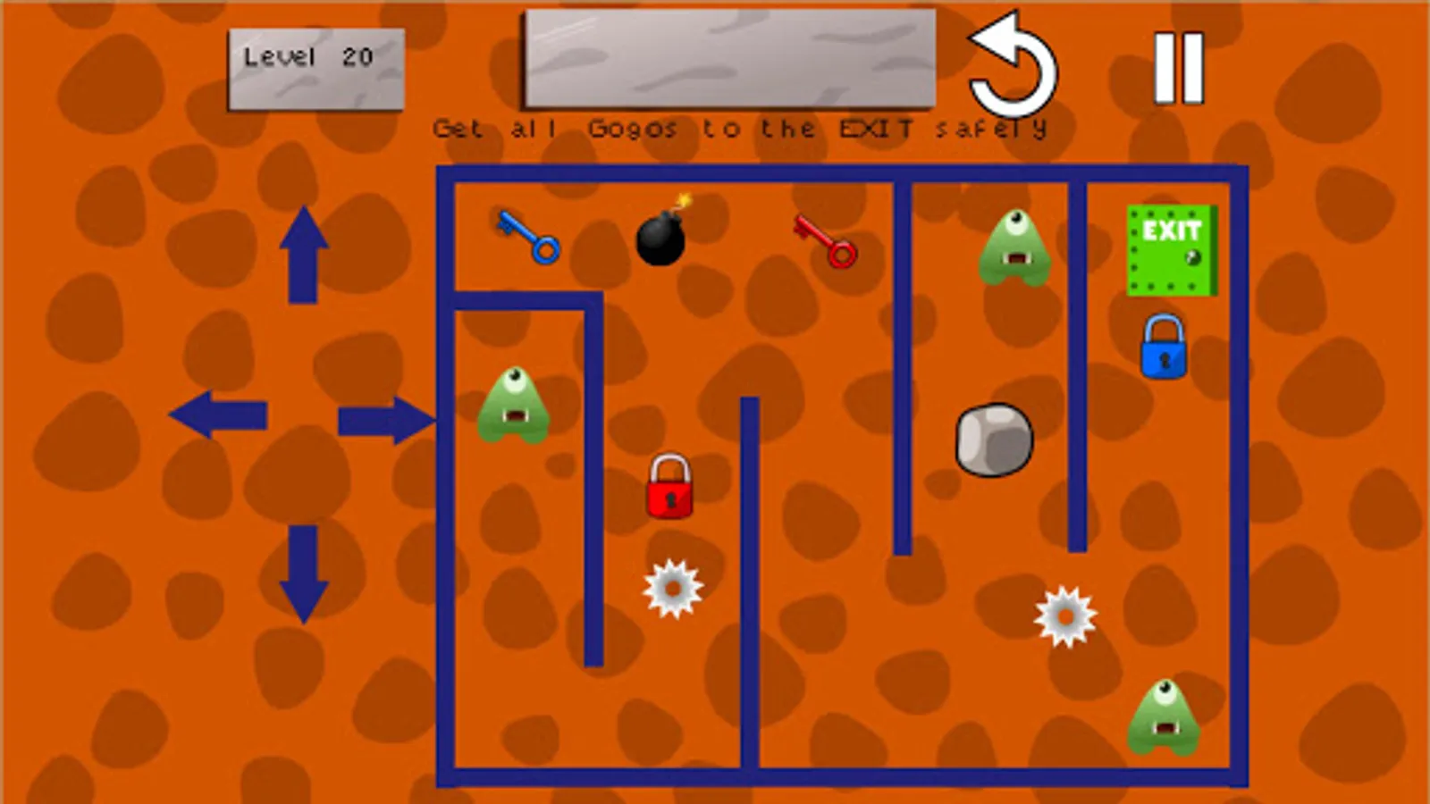 Three little Gogos are trapped in a maze filled with perilous objects. Help them to navigate the dangers and reach the Exit safely. Watch out for moving saws and bombs.