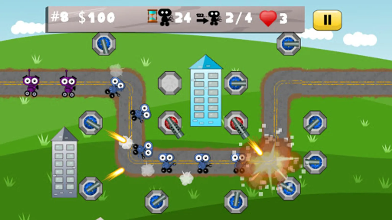 Enemy robots are attacking your city. You must buy shooting rockets and put shooting rockets at the correct place to stop enemy robots. Every robot you kill, you get money. Use money to buy more shooting rockets.