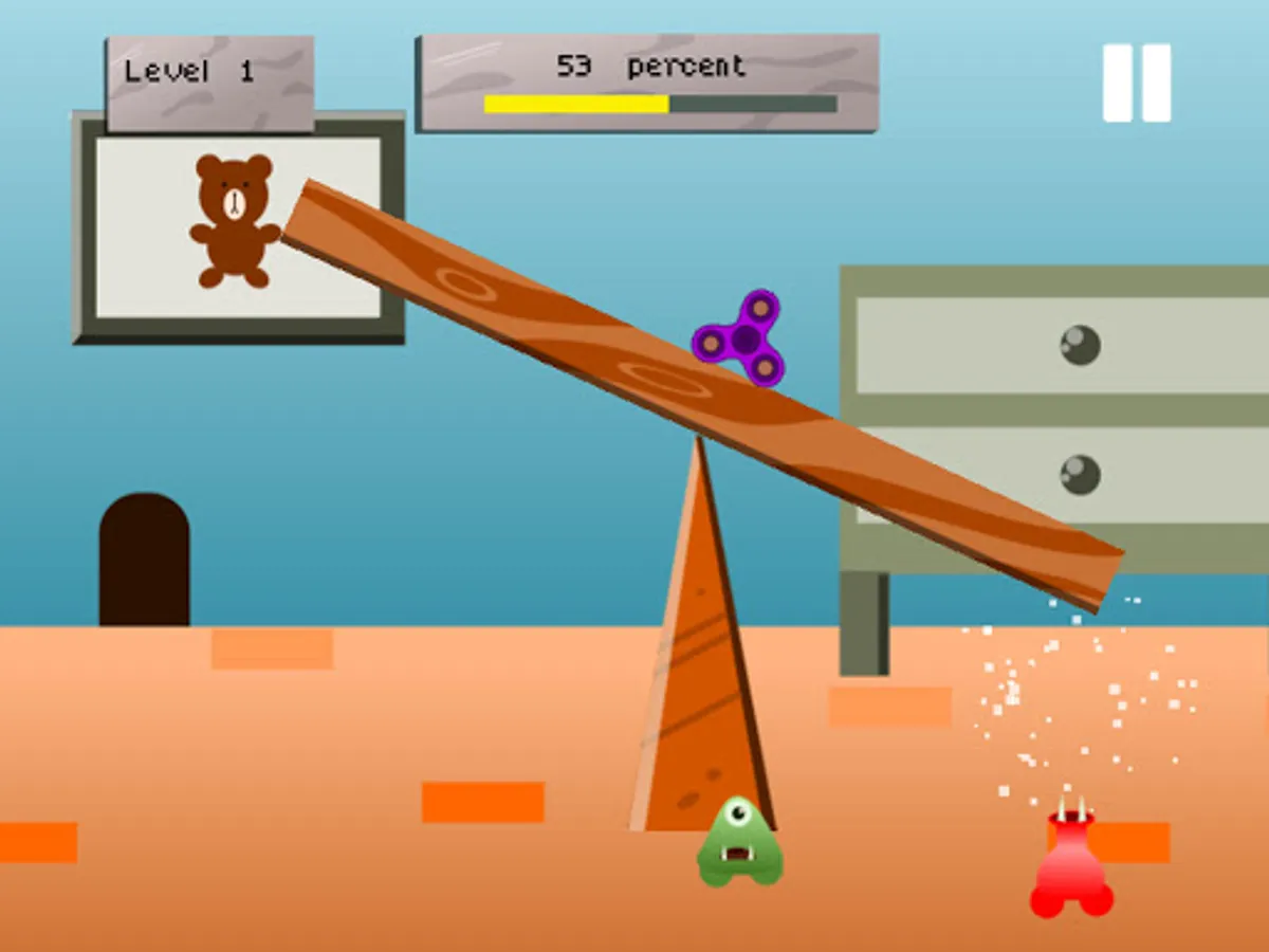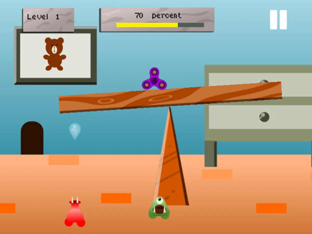 Spin the fidget hand spinner and balance on the wooden plank for the desired amount of time to complete each level. Gogo and Gigi, the green and red blob monsters are waiting at the bottom for the spinner to drop. Gigi will move around and spit at the plank to try to unbalance it and make the spinner fall. Gogo will open its mouth awaiting eagerly to eat it! Experience the realistic movement, physics and gravity.Enjoy the fidget spinner while having a good laugh at the funny antics of Gogo and Gigi. Also trains your coordination and grasp of gravity and momentum. See how many levels you can go.