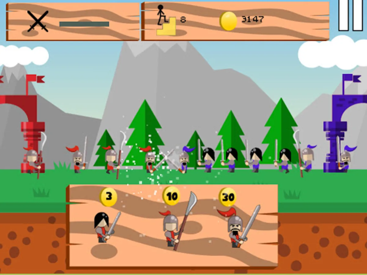 You are the leader of blue army of warriors. Your goal is to conquer enemy palace. Your warriors include general, spear and sword. In the battle field, each warrior has different skills. The more skilful warrior cost more to train. Collect the gold coins. Use the coins to train the warriors and send them to the battle field.