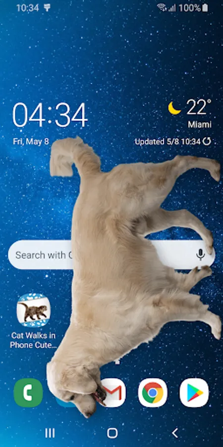 This innovative application will display animation of a cute dog (Golden retriever) on the screen of your phone. Just press "Show Dog" and give app permission to draw over other apps. Virtual animal will start to walk and bark on your screen. Our doggie will be visible almost all the time (it will be displayed in the foreground of all running apps). You can use your favorite social network, browse internet or play a game and you will still see quadruped running and hear its barking.