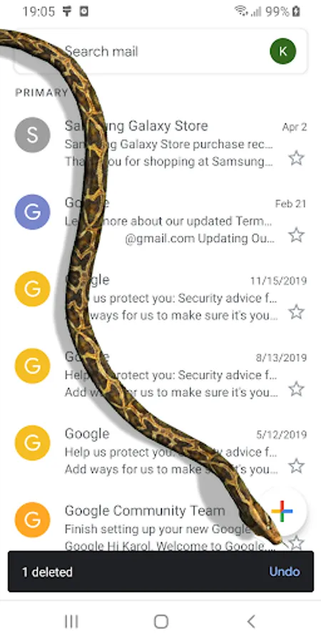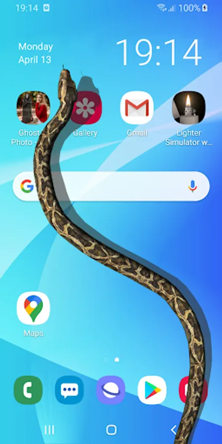 This awesome application will display animation of a snake (Python) on the screen of your phone. Just press "Show Snake" and give app permission to draw over other apps. Virtual snake will start moving and hissing on your screen. Our footless vertebrate friend will be visible almost all the time (it will be displayed in the foreground of all running apps). You can use your favorite social network, browse internet or play a game and you will still see crawling snake and hear its hissing.