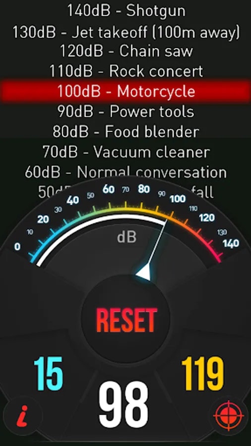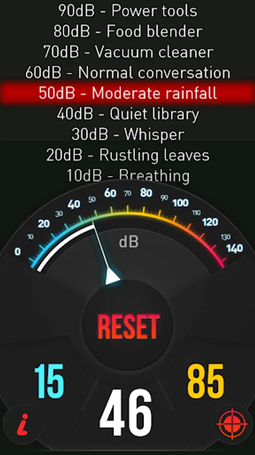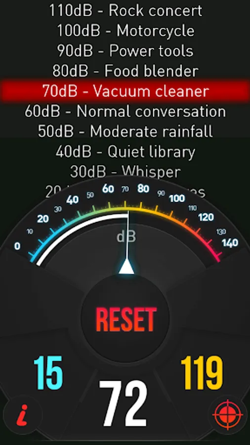 Measured noise level is presented with the help of indicator on the gauge. Loudness level varies between 0 and 140 dB. Besides live noise measurement the application displays also minimum and maximum registered level of the sound. You can clear it any time by using "Reset" button.