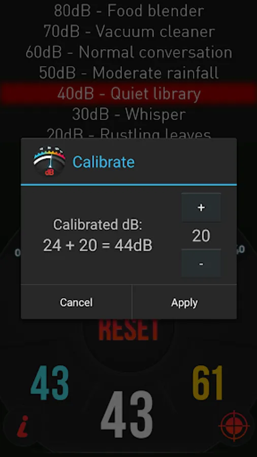 If you have access or you possess professional sound pressure level measurements device (SPL meter) you can use it to calibrate our app. Firstly, check current decibel reading on scientific measurement device. Next open our calibration menu (calibration icon under MAX value) i our app and set the same value using +,- buttons.