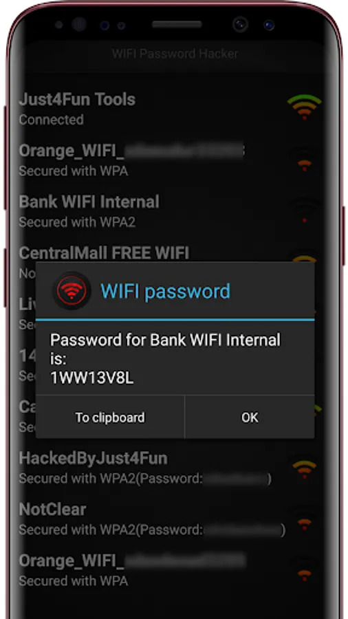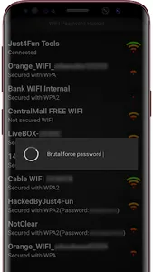 Before you start our utility app you need to turn on WIFI adapter. For Android 8.0 and above you also need to turn on Location services in settings. Next, open app and press "Start". App will search for all available WIFI networks in your area and display them on the screen. Select network you want to pretend to hack into (network must be secured with security protocol e.g. WEP, WPA2). Hacking progress bar will be displayed. It will look as if the app was trying to crack secured WIFI. In fact, nothing will be done. After few seconds you will get fake password for chosen wifi.