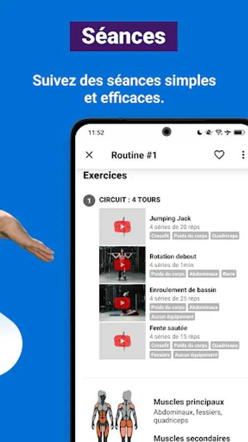 Each exercise is explained with an explanatory video (more than 500 video exercises) of the movement, the number of repetitions to be done, the load to be used and the rest time to be taken.
