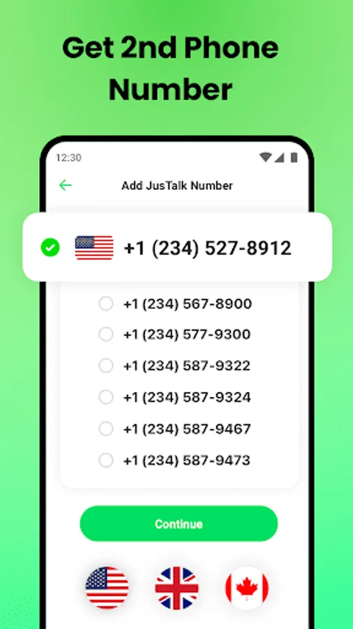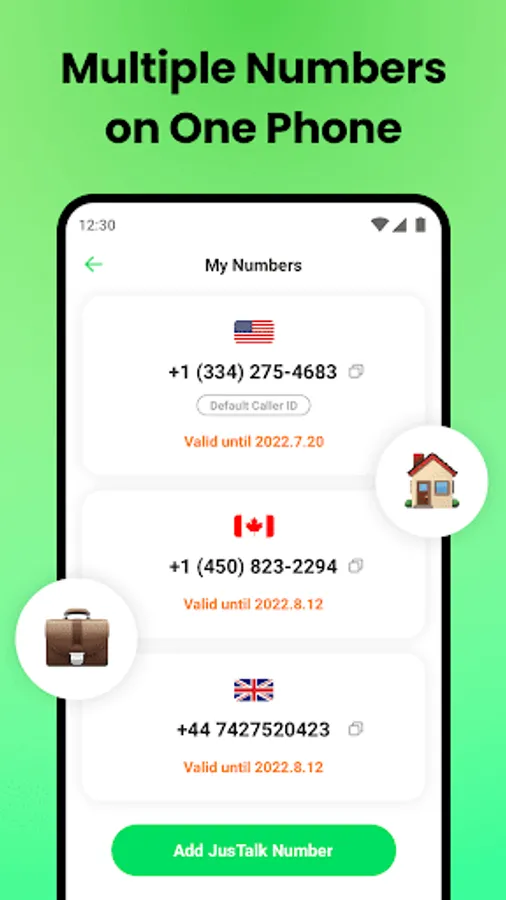 JusTalk 2nd Phone provides you with real numbers in different countries at low prices, you can choose US number, GB number, etc. Get a 2nd number and make real & free phone calls, text messages now.