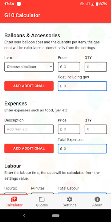 Helium and Air fill options are available when estimating, along with specifying any additional accessories, labour or any other costs.