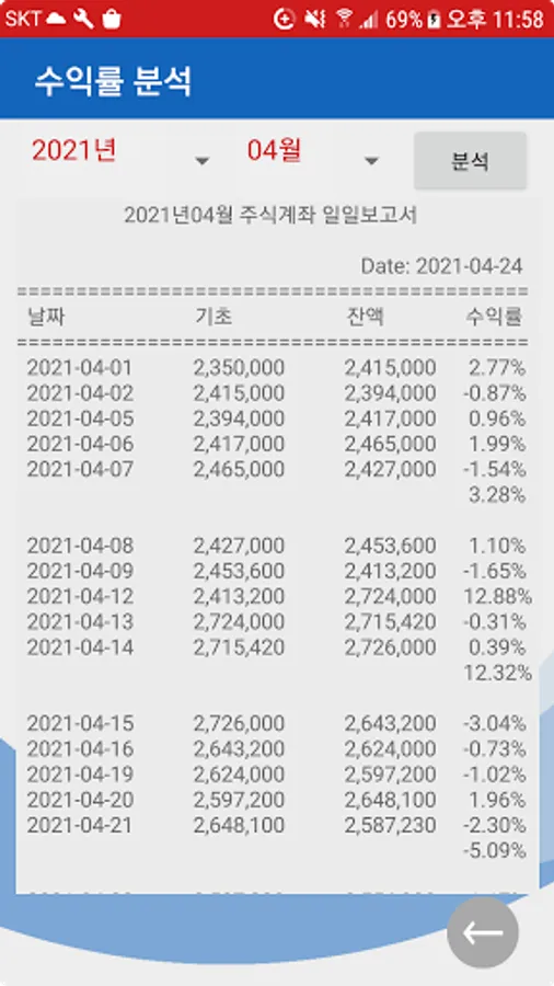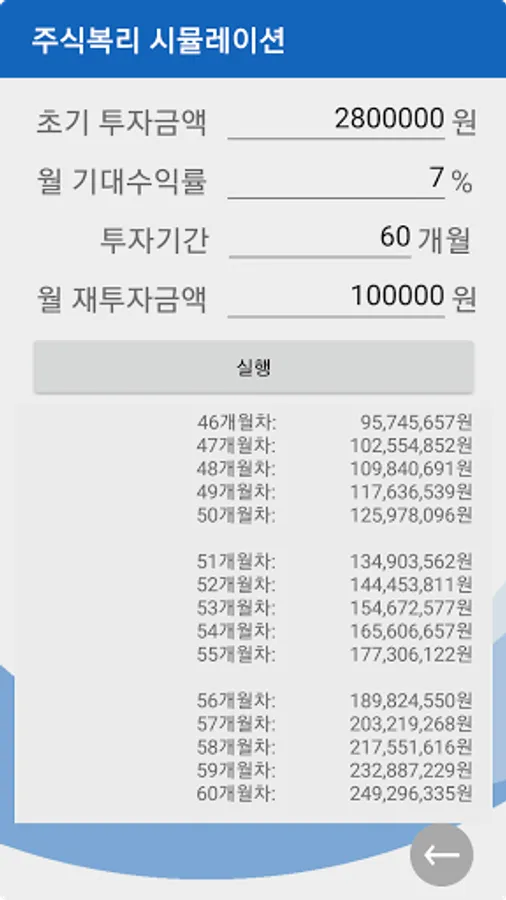 Enter 4 items (initial investment amount, monthly expected rate of return, investment period, monthly reinvestment amount) and click the Run button.