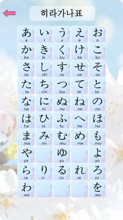 3. Hiragana Table Button-Moves to the hiragana 50-pitched screen and displays the entire Hiragana