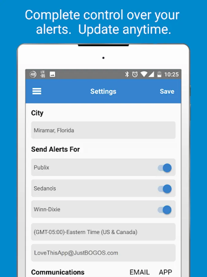 Update at any time. Choose how you want to receive your alerts: Through the app, email, or both. Select the supermarkets you want to receive the alerts for. Settings updated in the app are also reflected in your online account and vice versa.