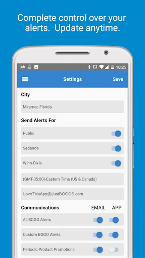 With the JustBOGOS app it's effortless to save money on groceries without having to clip coupons or search the weekly ads. Never miss your favorite BOGO (Buy One, Get One) deals again at Publix, Winn-Dixie and Sedano’s supermarkets with Weekly ALL BOGO Alerts and Custom BOGO Alerts. Receive your alerts via push notifications directly to your Android device, email or both. Your weekly savings are now on auto-pilot!