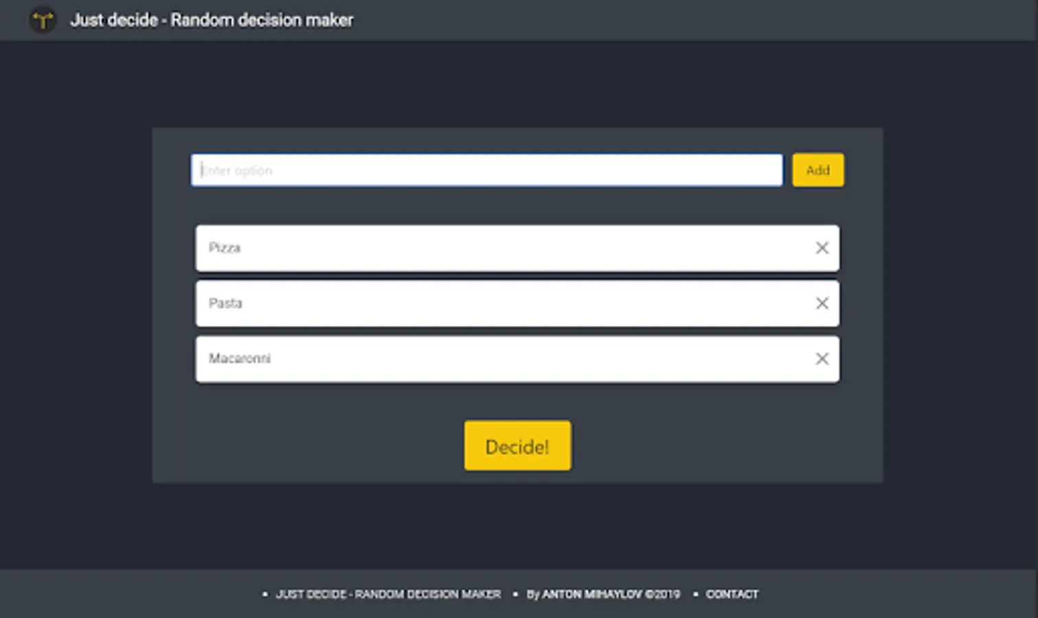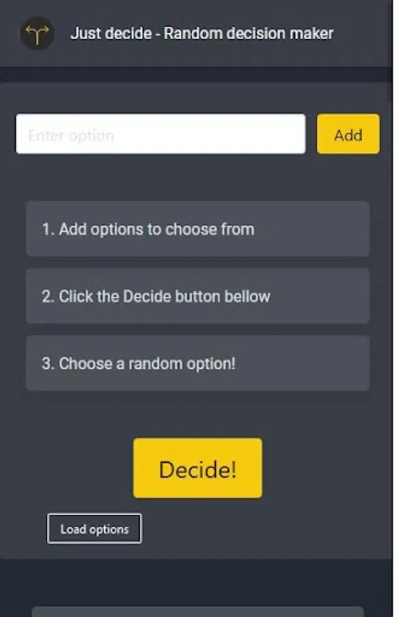 It's very easy to use. You add the choices in the app and the click the decide button. All of your choices will get shuffled and you'll have to pick one at random!