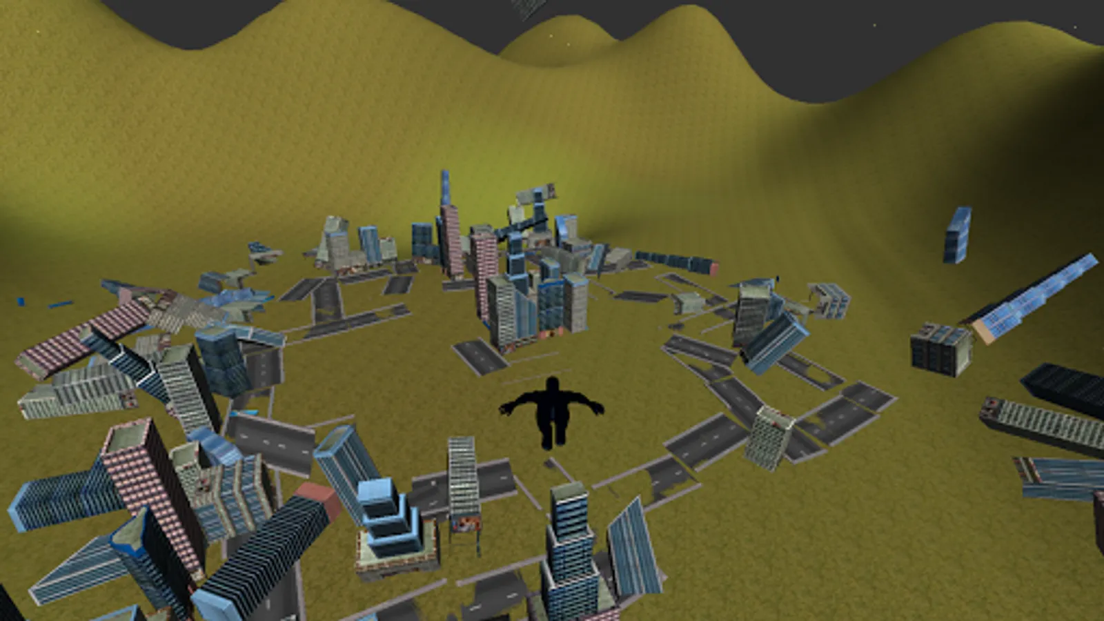 This is a simulation of a flying man. You can fly or run wherever you want. Collect power and fire them at cities to destroy.