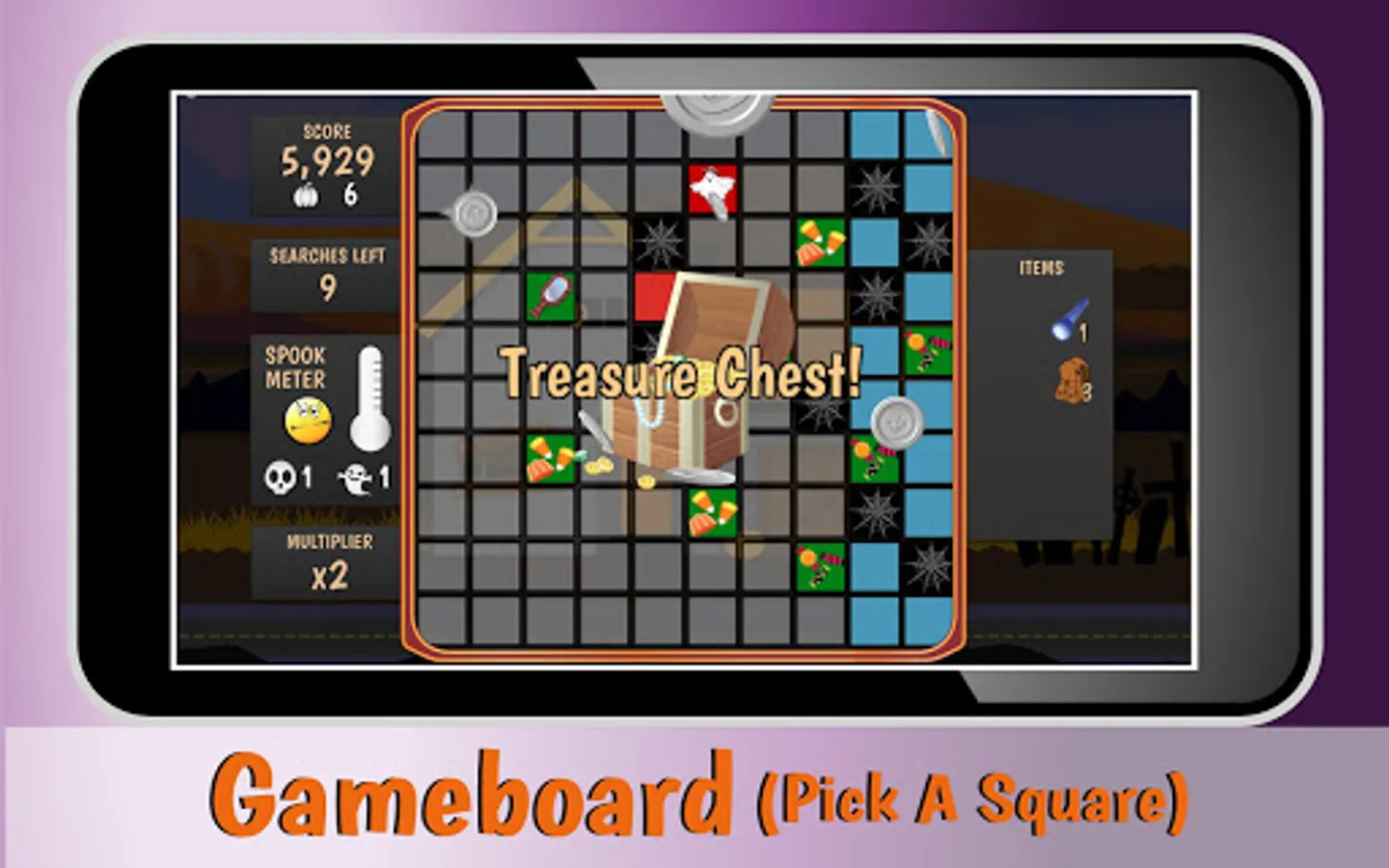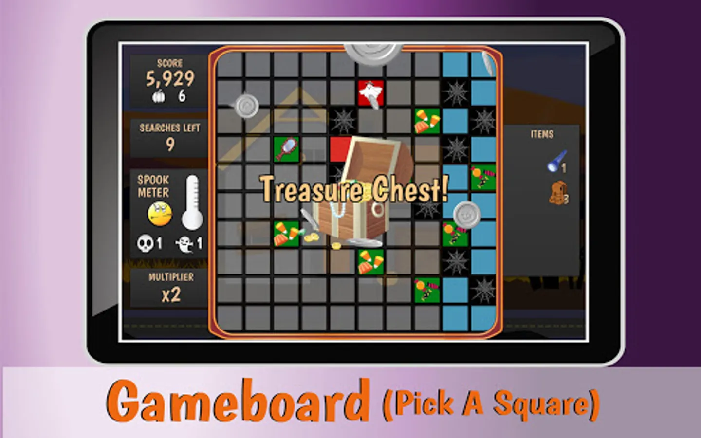 Get into the Halloween spirit with an easy pick-a-square game testing your luck and bravery while exploring spooky haunted houses. You will encounter scary ghosts, skeletons, and black cats while you collect trick-or-treat goodies and treasure. The goal is to find the ultimate pumpkin, the golden jack-o-lantern, without getting spooked out of the house.