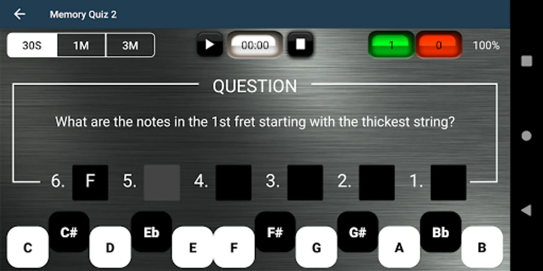 It has four training modes, Name The Note where you have to name the note shown on the neck, Find A Note where you have to find a given note on the neck in all 6 positions, Memory Quiz 1 where you have to name a note having been given it's position, and Memory Quiz 2 where you must name all the notes across a given fret (a tough one!!).