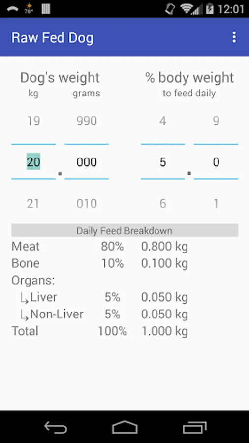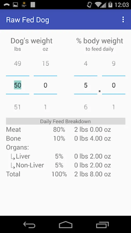 In order to raw feed safely and properly, your dog must receive nutrients from a variety of sources, including bone, meat, and organ. This app allows you to calculate your dog's portions using the 80/10/5/5 prey model raw guidelines. Featuring U.S. and metric measurements!