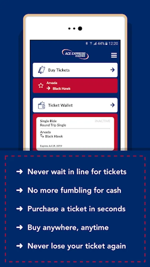 Buy your Casino Bus tickets on the go, with Ace Express Coaches' new mobile app! No more carrying cash, or losing tickets. View your tickets in your electronic wallet and then activate when you board. Break or lose your phone? No problem- your tickets stay in your account and will be there when you log-in from a new device. (Ace Express Coaches provides from Denver metro to Black Hawk and Central City.)