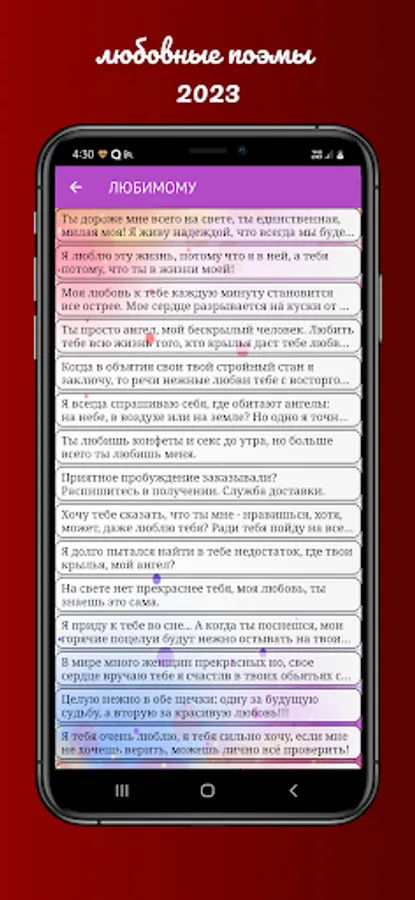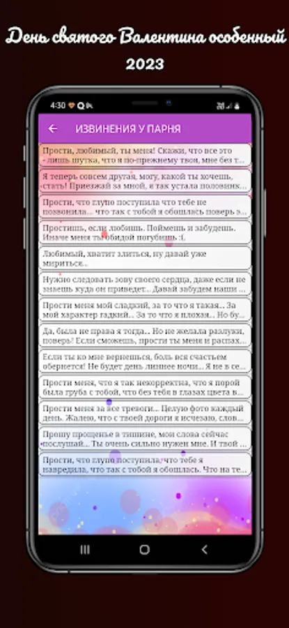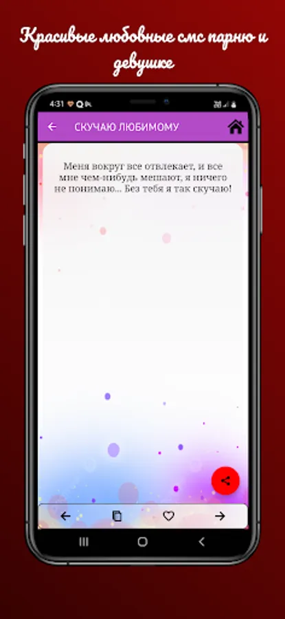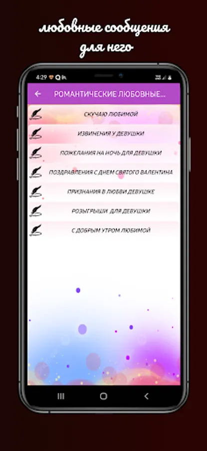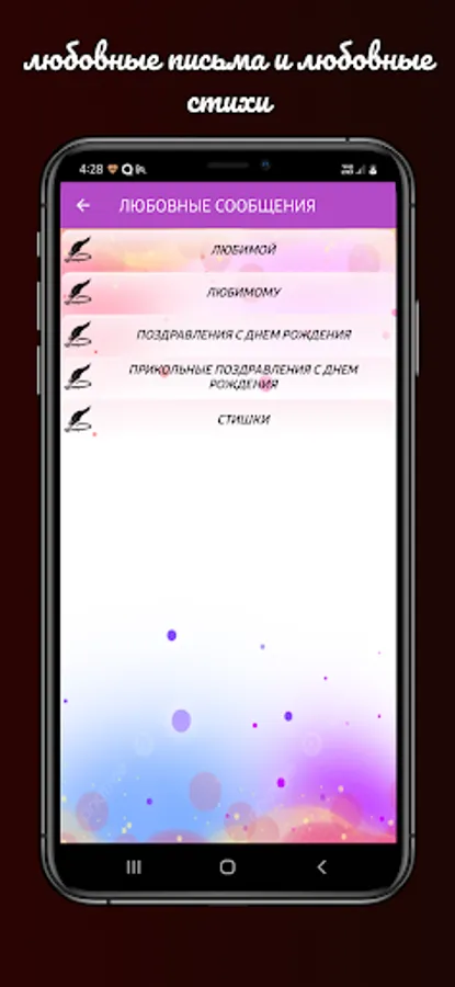 Сборник любовных смс - это лучший сборник смс, состоящий из более чем 2000 любовных сообщений. Теперь можно не ломать голову, придумывая оригинальное SMS. Данное приложение поможет признаться в любви дорогому Вам человеку, написать комплимент, рассказать о своих искренних чувствах любимым. Позволяет сразу из приложения отправлять смс. Так же можно признаться в любви или поздравить любимого человека с помощью открыток.