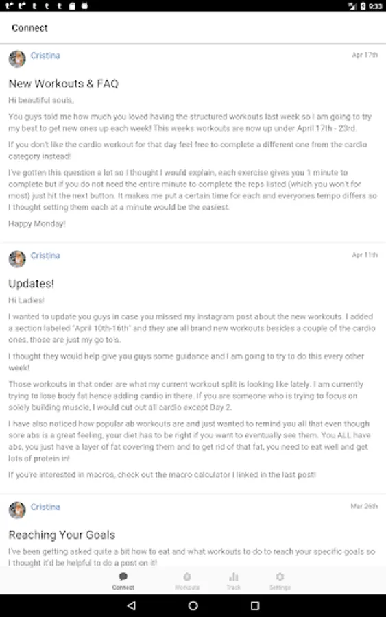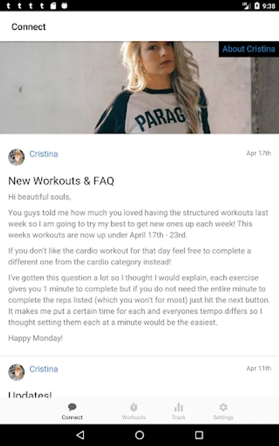 • A “Connect” section to see updates from Cristina and other women in the CCFIT community