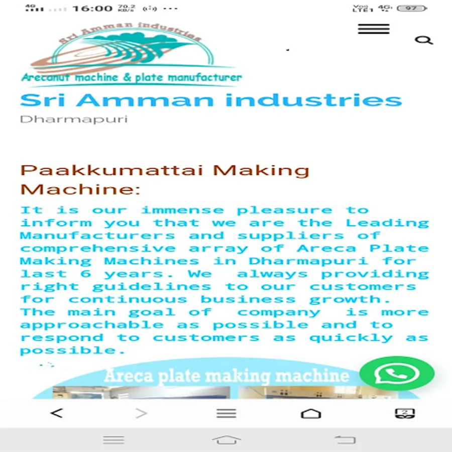 It is our immense pleasure to inform you that we are the Leading Manufacturers and suppliers of comprehensive array of Areca Plate Making Machines in Dharmapuri for last 6 years. We always providing right guidelines to our customers for continuous business growth. The main goal of company is more approachable as possible and to respond to customers as quickly as possible.