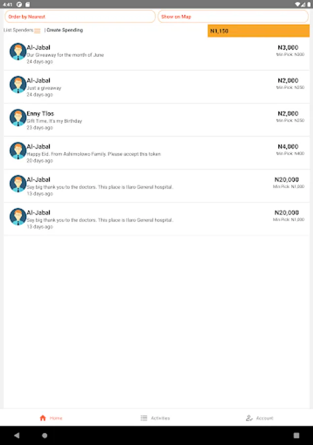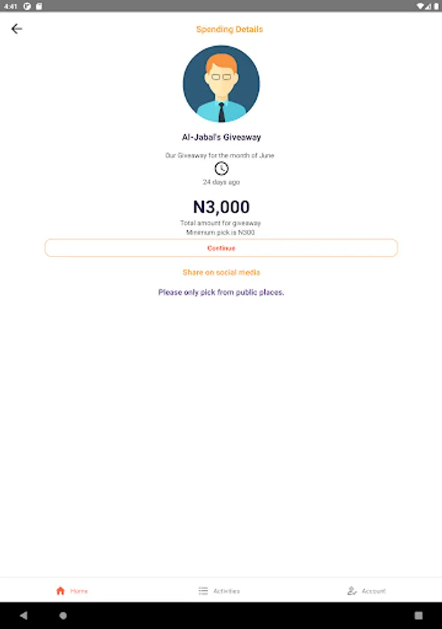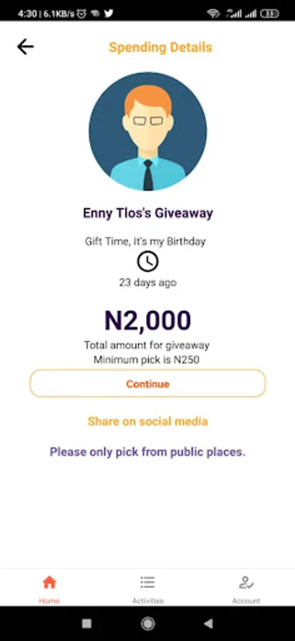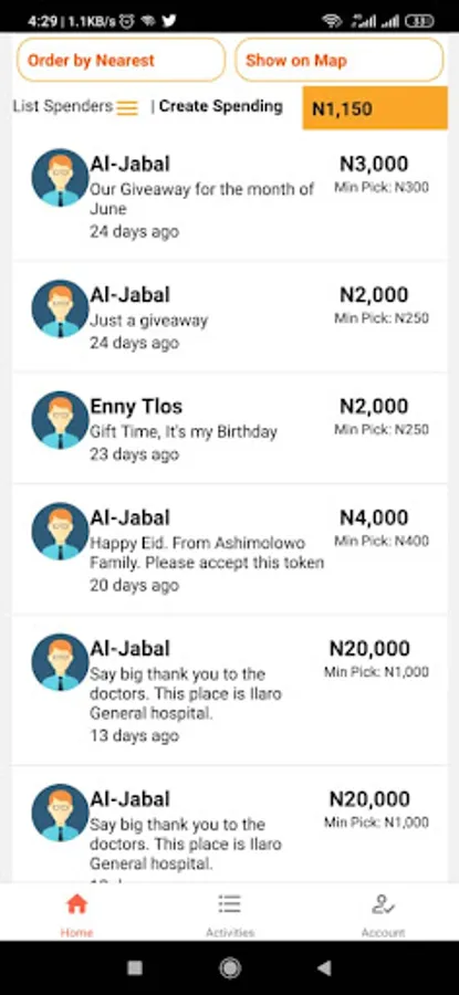 Pickerpoint make give away easy by you the giver create spending(giveaway) and the receiver(picker) will come around the specific location to receive the money.