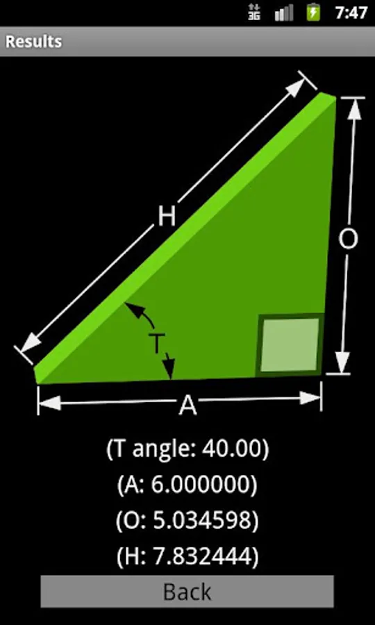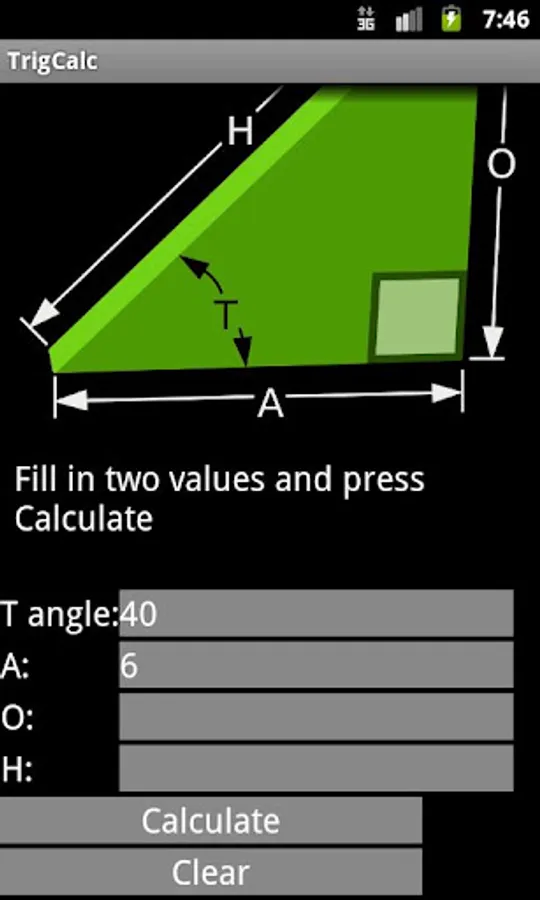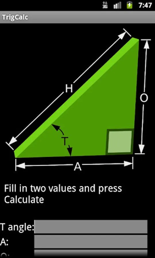 This very basic app allows you to calculate right-angle Trigonometry values with a simple, easy to understand interface. The app takes two arguments as input (you decide which two) and then calculates the remaining values for you. The app is very simple and someone who knows trig by heart could accomplish the same thing with a basic calculator, but it may be useful for those people that don't use trig often. Known Issues: some unacceptable types are not blocked (big angles will result in negative side lengths)