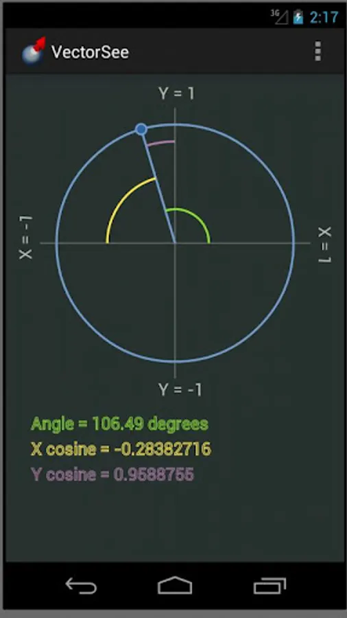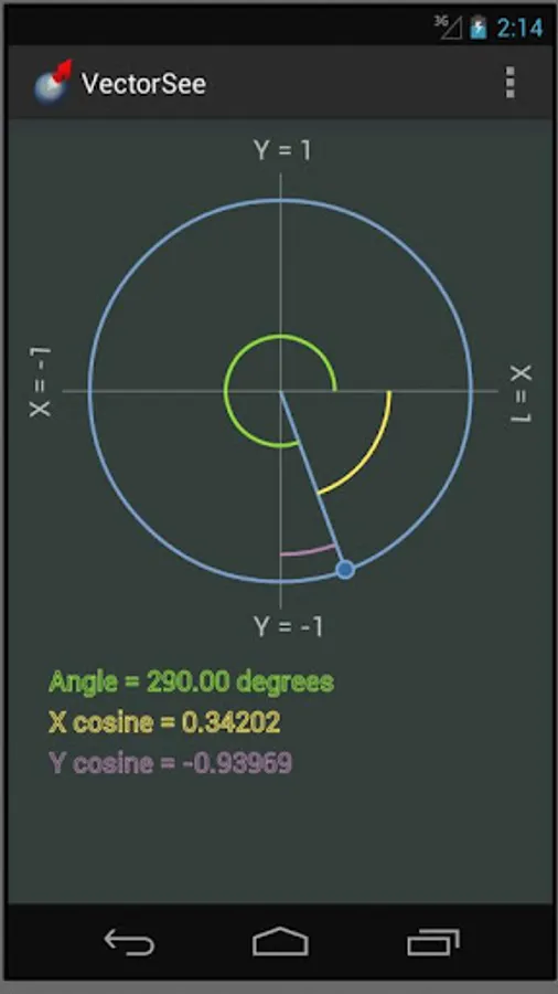 A simple tool for visualizing vectors (such as used on CMMs). The vectors can be updated with a touch anywhere on the circle. The angle found is shown along with the cosines from the X axis and Y axis.