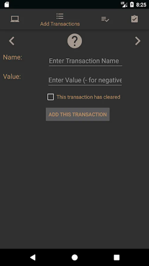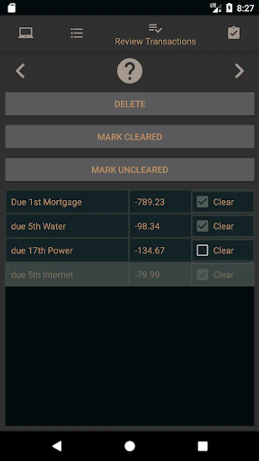 2. Next you enter all your regular transactions (these are stored in the database so you can easily edit what has cleared in the future).