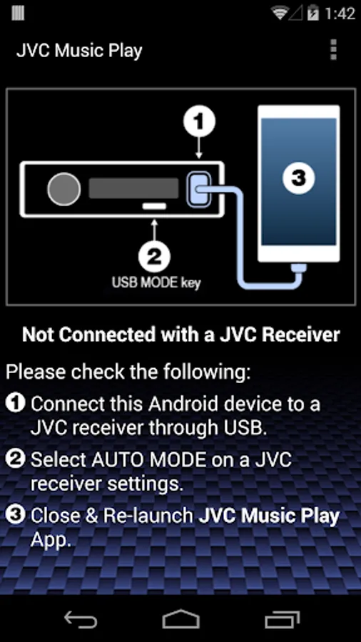 JVC Music Play is the app to listen to music from your Android device (Android OS 4.1 to 7.x) with the JVC car-audio receiver connected via USB.