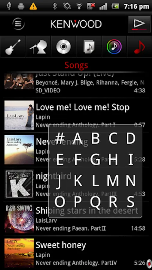 Connecting your Android device in which this application is installed to your Kenwood audio system via a USB allows you to control the audio system: for example, searching for a song in the Android device by artist name or album name.