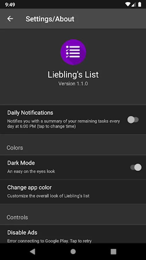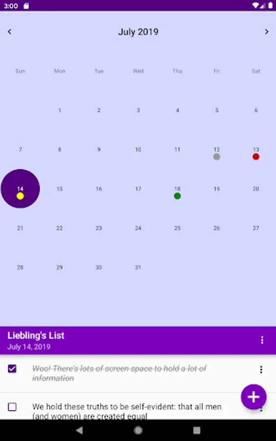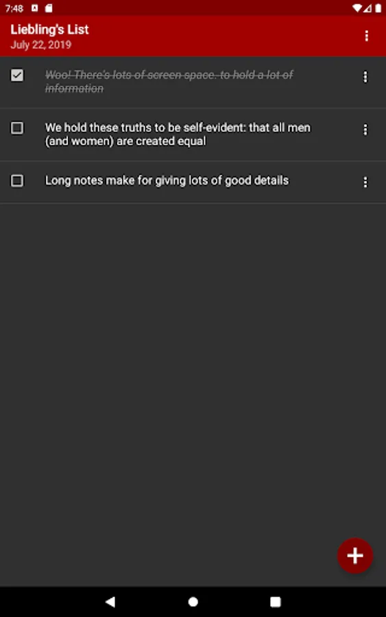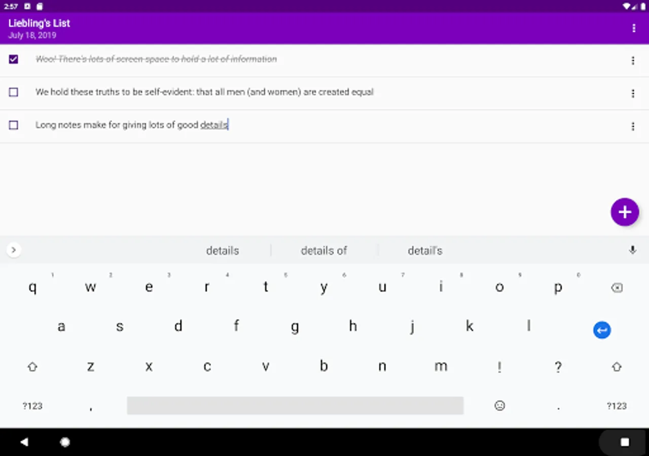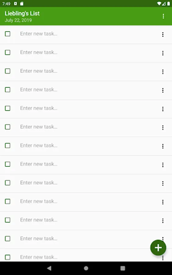 Many note-taking or calendar apps require many taps to enter an activity, or come with unnecessary integrations into cloud services. None of this exists with Liebling's List; your list is your list - on your phone or tablet and that's it. It only takes one tap to add an item, then you can immediately start typing. You can't get much simpler than that.