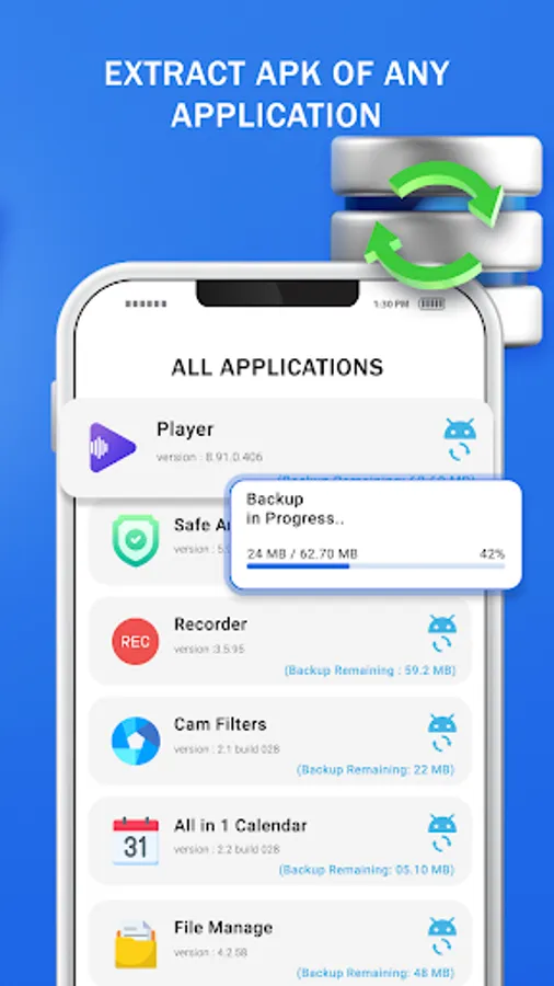 - Take Backup : Take back up of any installed application as APK file. You can also share this apk with others.