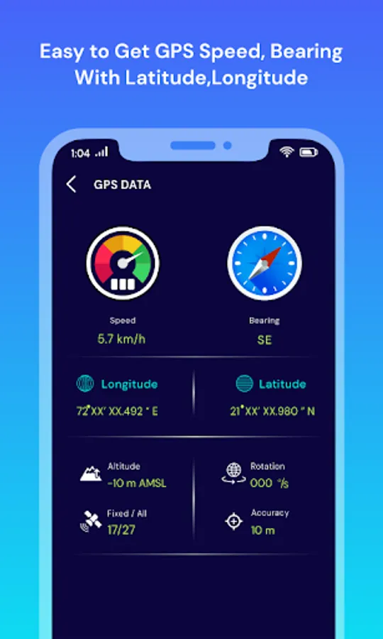 GPS Data app helps you to get all information about your GPS - like latitude, longitude, Altitude, speed and lots more information related to GPS.