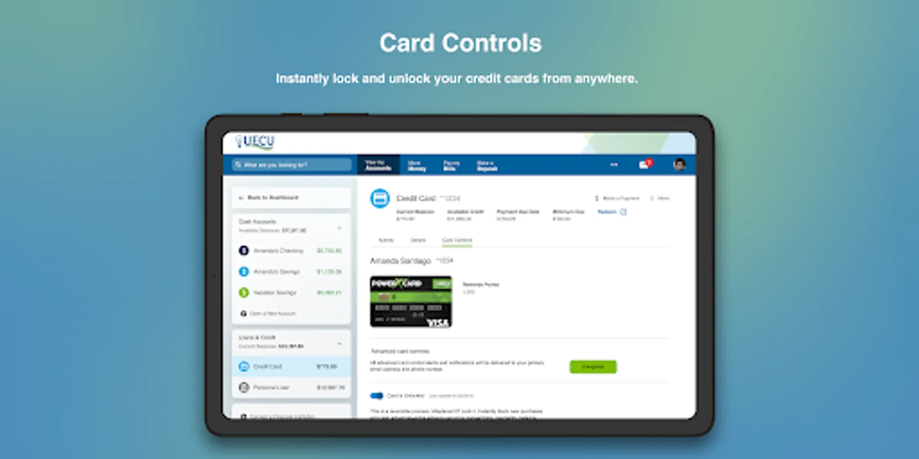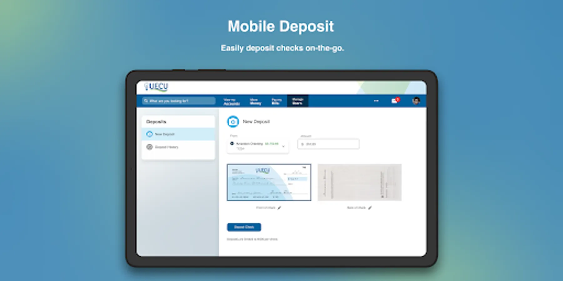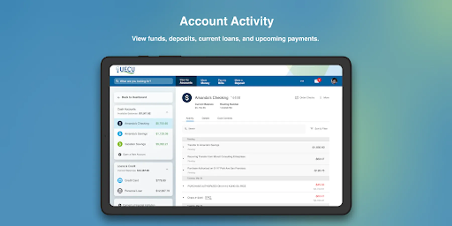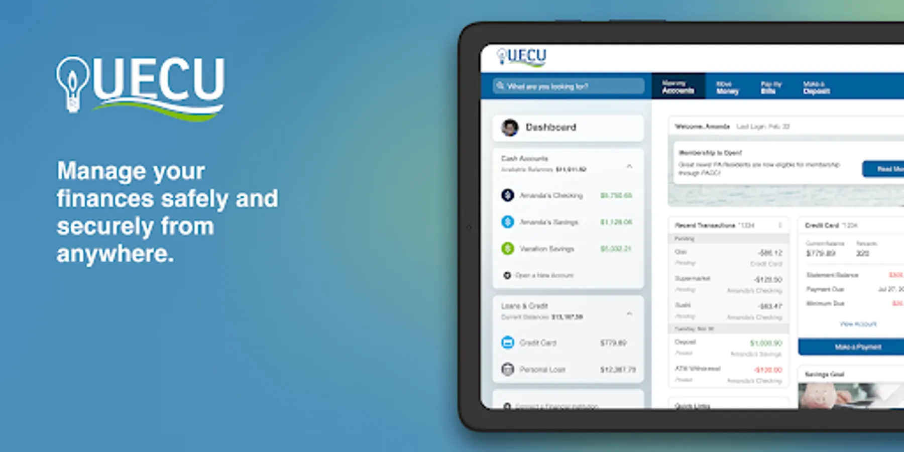 Manage your UECU accounts securely and conveniently from anywhere, using the UECU Mobile Banking App. Whether you want to check your account balance, view your account info, deposit a check, redeem your rewards, apply for a loan, set up a skip-a-pay, make and edit payments, or turn your UECU Visa® cards off or on – you can do it all from your mobile device.